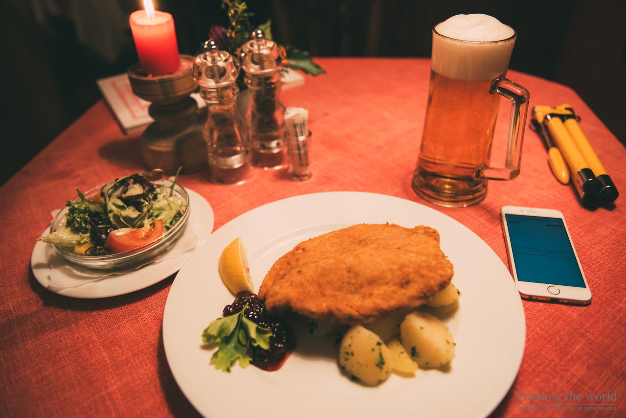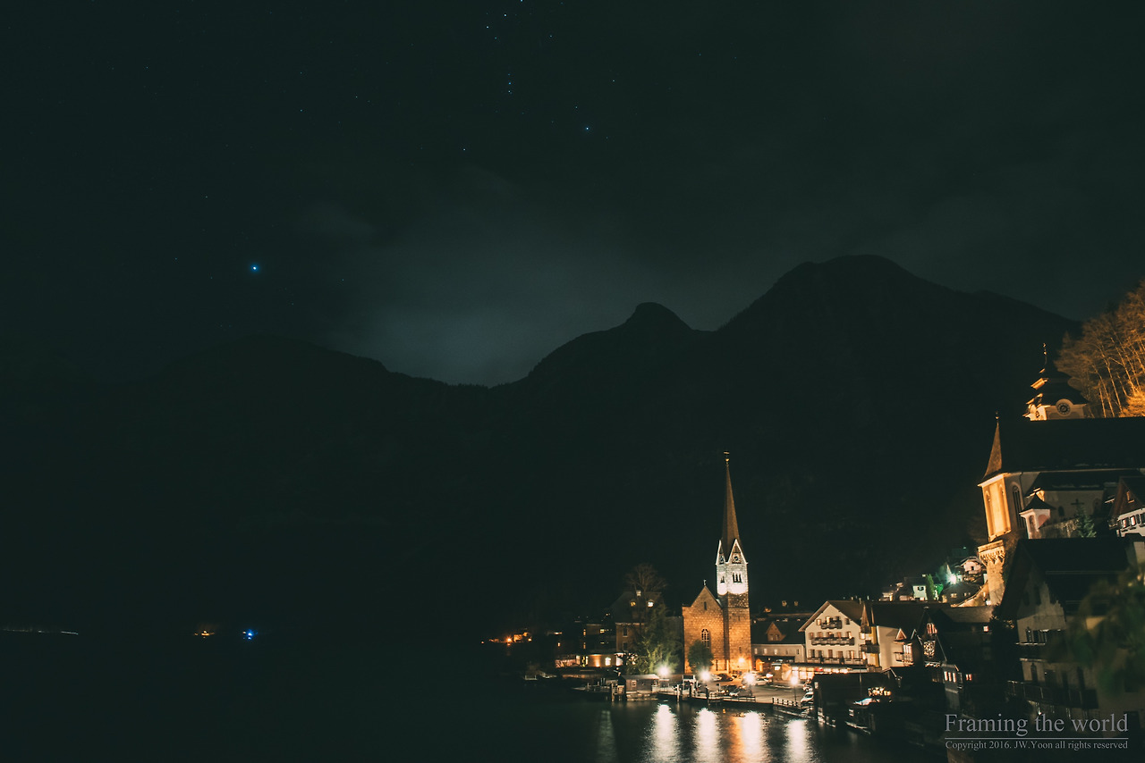 숙소에 짐을 간단히 풀고 카메라를 챙겨 할슈타트의 야경을 찍기 위해 나섰다. 오스트리아의 전통 음식이라는 슈니첼을 먹고(이름만 슈니첼이지 그냥 돈가스였다. 오스트리아인들은 우리나라에 와서 돈가스를 먹으며 고향의 맛을 떠올릴지도 모르겠다는 생각을 했다.) 길을 쭉 걸어 마을이 한눈에 내려다 보이는 곳에 자리를 잡고 사진을 찍었다. 저 멀리 5 fingers와 알프스의 만년설은 이미 짙은 어둠에 가려 희미하게 형체만 드러내고 있었다. 그렇게 천천히, 느리게 셔터를 눌러 사진을 찍었다.