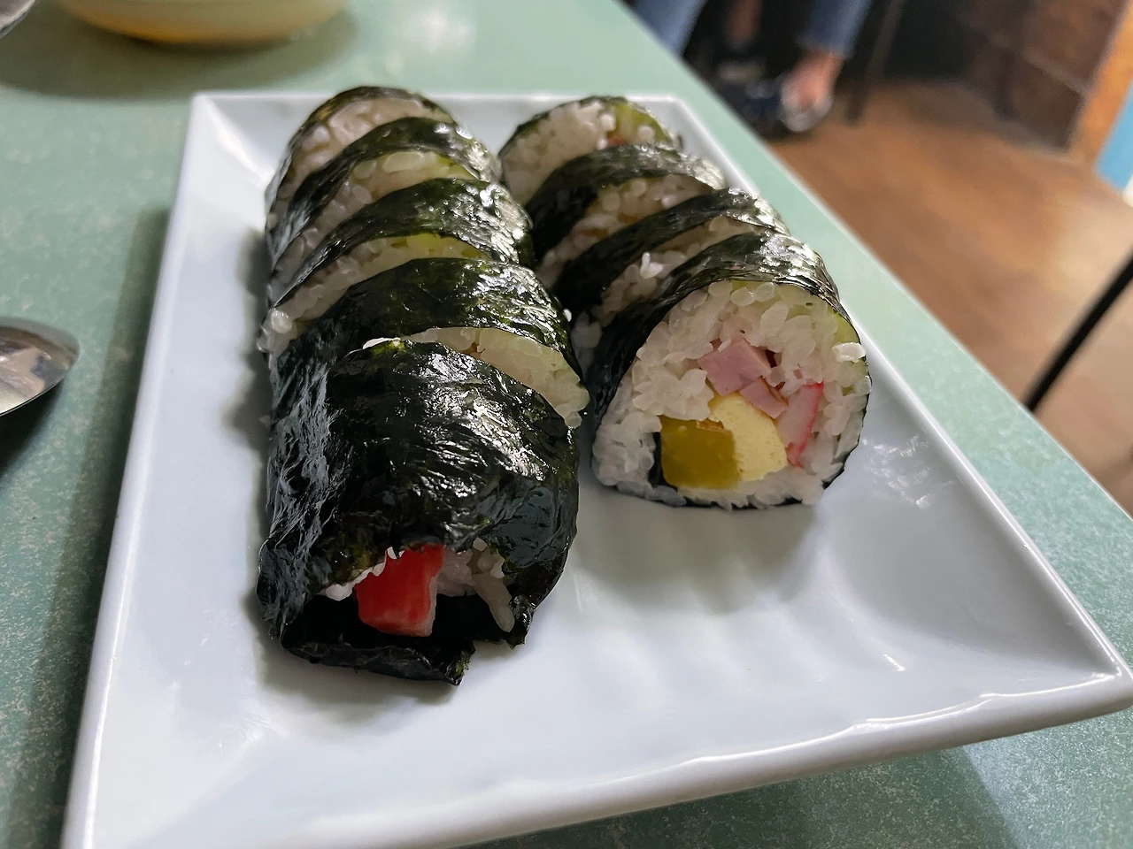 다소 빈약해 보이는 김밥이지만 단무지와 계란 지단, 햄과 게맛살 등 들어있을 건 다 들어있다. 하나 입에 넣어보니 의외로 알맞은 소금간에 참기름 향이 꽤 잘어울리더라.
