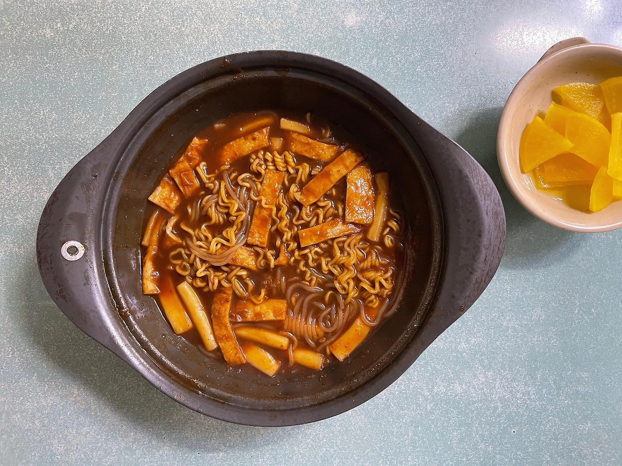 오? 이거 짜장색이 도는 것과 라면 사리가 들어간 걸 빼면 암사분식 추억의 떡볶이와 진짜 비슷하다. 비주얼은 그럴싸하네? 일단 한젓가락 떠먹어보니, 짜장 컬러에 비해 그다지 짜장맛은 나지 않고 좀 심심해도 먹을만하다.