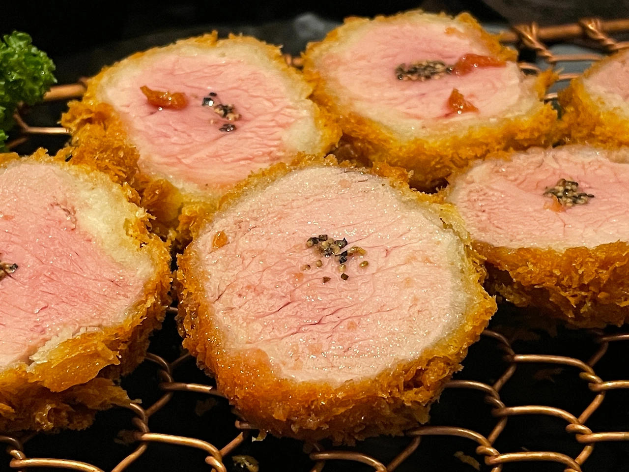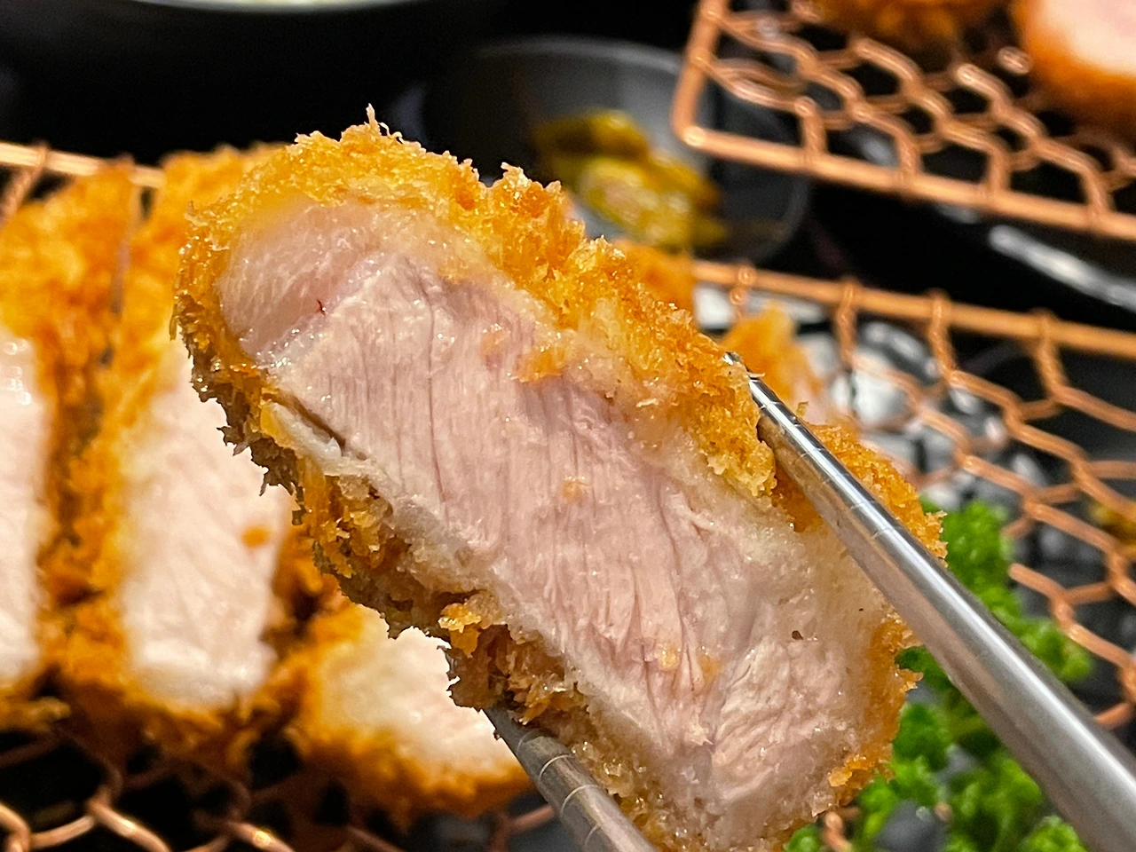 맛 좋은 건 더 크게 봐야지? 수비드 한 것도 아닌데 부드러우면서도 모두 익을 만큼만 딱 구워졌다. 돈카츠는 손질된 고기를 보통 반죽 물에 담근 후 빵가루에 묻혀 튀기는데, 반죽 물이 익으면서 빵가루와 고기를 붙여주는 동시에 고기에 막을 형성해 육즙을 가둬두고 튀김 기름이 고기에 스며들어 느끼해지지 않도록 해주는 역할을 한다. 와… 저 반죽 물 익은 두께 일정한 거 보소. 고기 안에 갇힌 고소한 돼지 라드가 보이는가.