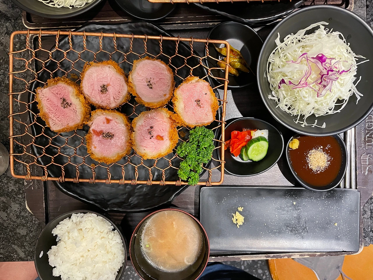 먼저 등심 돈카츠. 고추 절임과 야채 초절임, 돈카츠 소스와 장국, 밥과 샐러드의 기본적인 한 상 차림이다. 일단 밥도 고슬고슬하고 절임류도 맛이 과하지 않고 딱 적당히 상큼한 정도. 와.. 되게 애매한 말인데 달래 이렇게밖에 표현을 못하겠네. 덜 시고 덜 달고 덜 짜고, 더 시고 더 달고 더 짜고의 딱 중간 정도? 양배추 샐러드는 테이블 옆에 유자 폰즈소스를 뿌려서 먹으면 된다. 근데 저 초록색과 하얀 가루는 무엇일까. 그 전에, 일단 고기부터 보자.