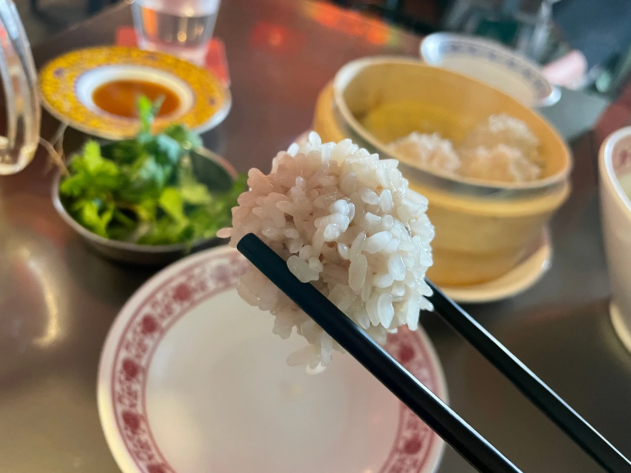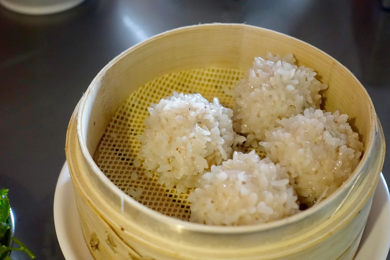 시켜놓은 칭따오 맥주와 마늘쫑면을 다 비울 때쯤 진주 완자가 나왔다. 진주 완자는 돼지고기와 새우 소를 단단히 뭉친 후 찹쌀 위에 굴려 쪄낸 요리. 에어팟 하나 만 한 완자 네 알에 1만 원이 넘어 좀 비싸지 않나 싶었는데….