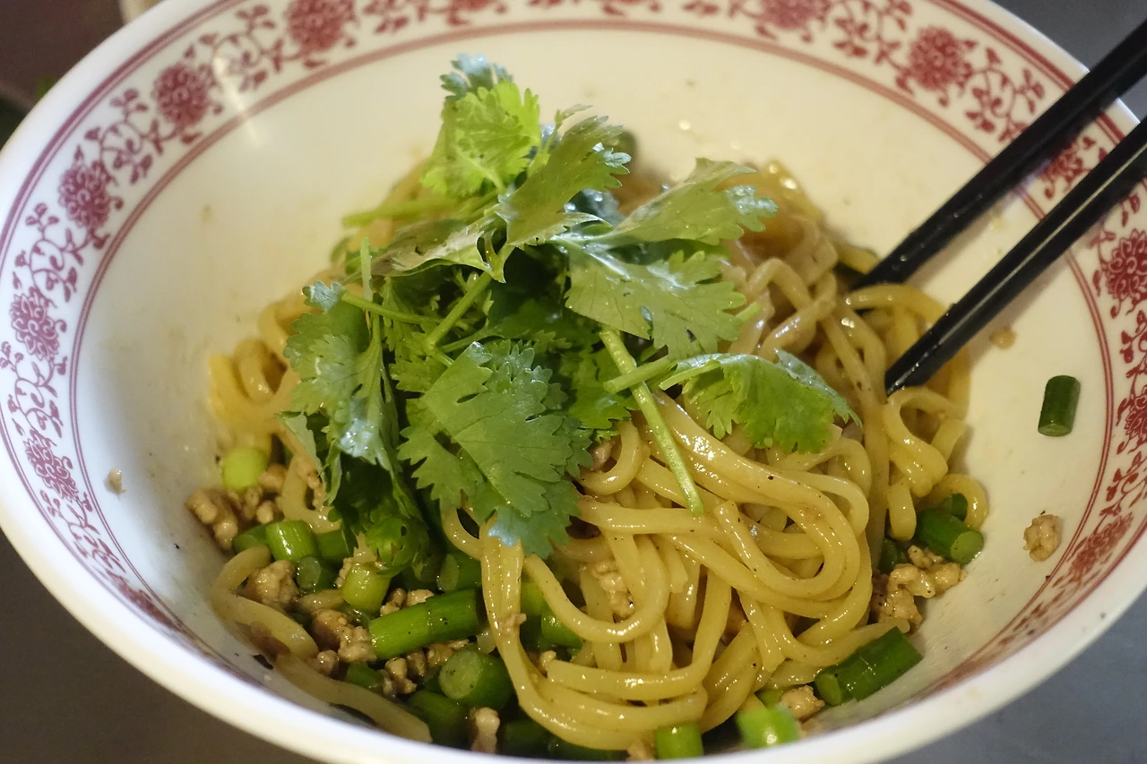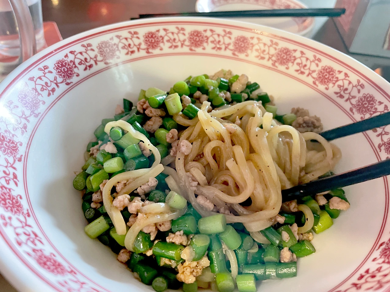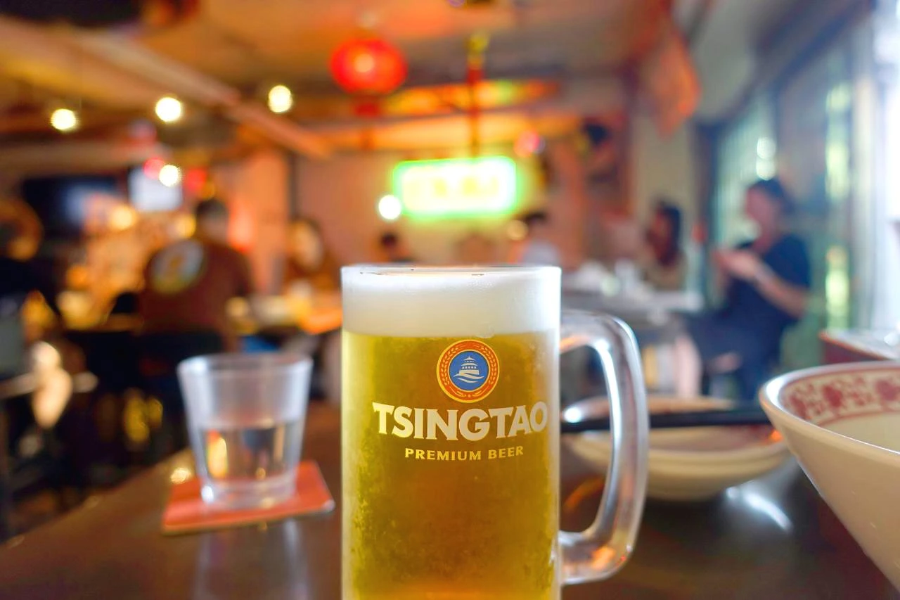 자리에 앉아 한 10분 기다렸을까, 금세 마늘쫑면이 모습을 보인다. 잘 비벼보니 기름과 굴소스에 잘 볶은 마늘쫑과 고기에 약간의 육수 또는 면수를 넣어 면과 볶아내 온 듯. 너무 찰기가 있지도 않지만 마늘쫑과 고기를 한 번에 집기가 쉽지 않다. 대충 떠먹어도 간이 싱겁지는 않지만 중국 사람처럼 그릇을 들고 젓가락으로 마늘쫑과 고기 건더기를 슥슥 입에 밀어 넣어 우걱우걱 씹으면 단맛과 짠맛, 마늘쫑의 살짝 매콤한 향과 식감이 잘 어우러진다. 이때쯤 맥주 한 잔. 첫 잔은 칭따오로 시작했다.