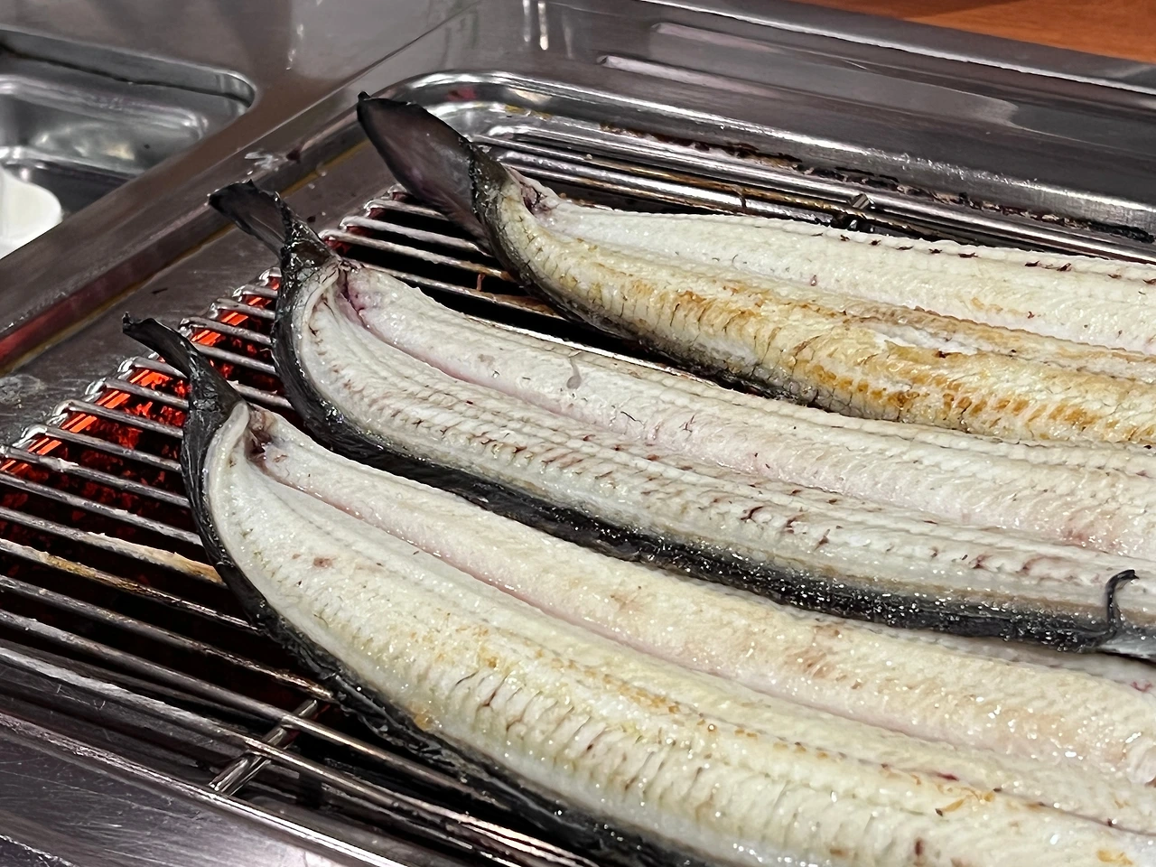 슬슬 장어가 따땃이 익어가는 중. 세 마리 모두 꼬리가 샥 말려 올라간다. 하지만 여기서 서두르면 안됨. 저 상태에서 두 마리는 소금을, 다른 한 마리는 간장 데리야끼 양념을 발라준 후 지글지글 구워준다. 간장 양념이 살짝 탈랑말랑 하면 완벽.