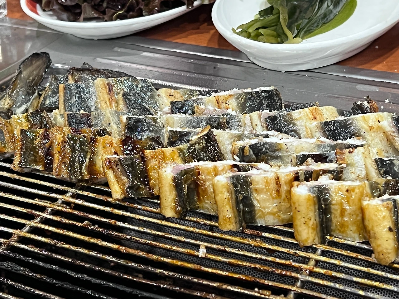 보통 이쯤 되면 맛있게 구워진 소금구이와 양념구이 장어의 인증샷이 착 올라와야 정상. 보통 장어를 먹을 땐 소금구이를 먹은 후 양념구이를 먹어야 장어 본연의 맛을 느낄 수 있다고 한다. 하지만 아는 사람은 다 알지. 양념 구이가 얼마나 소주와 잘 어울리는지… 다 익고 테이블 사람들이랑 소주 한 순배 돌자마자 다 먹어버리는 바람에 사진에서는 양념 탄 자국만 남아있음.