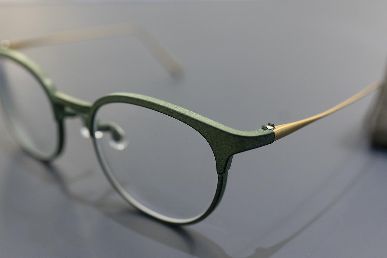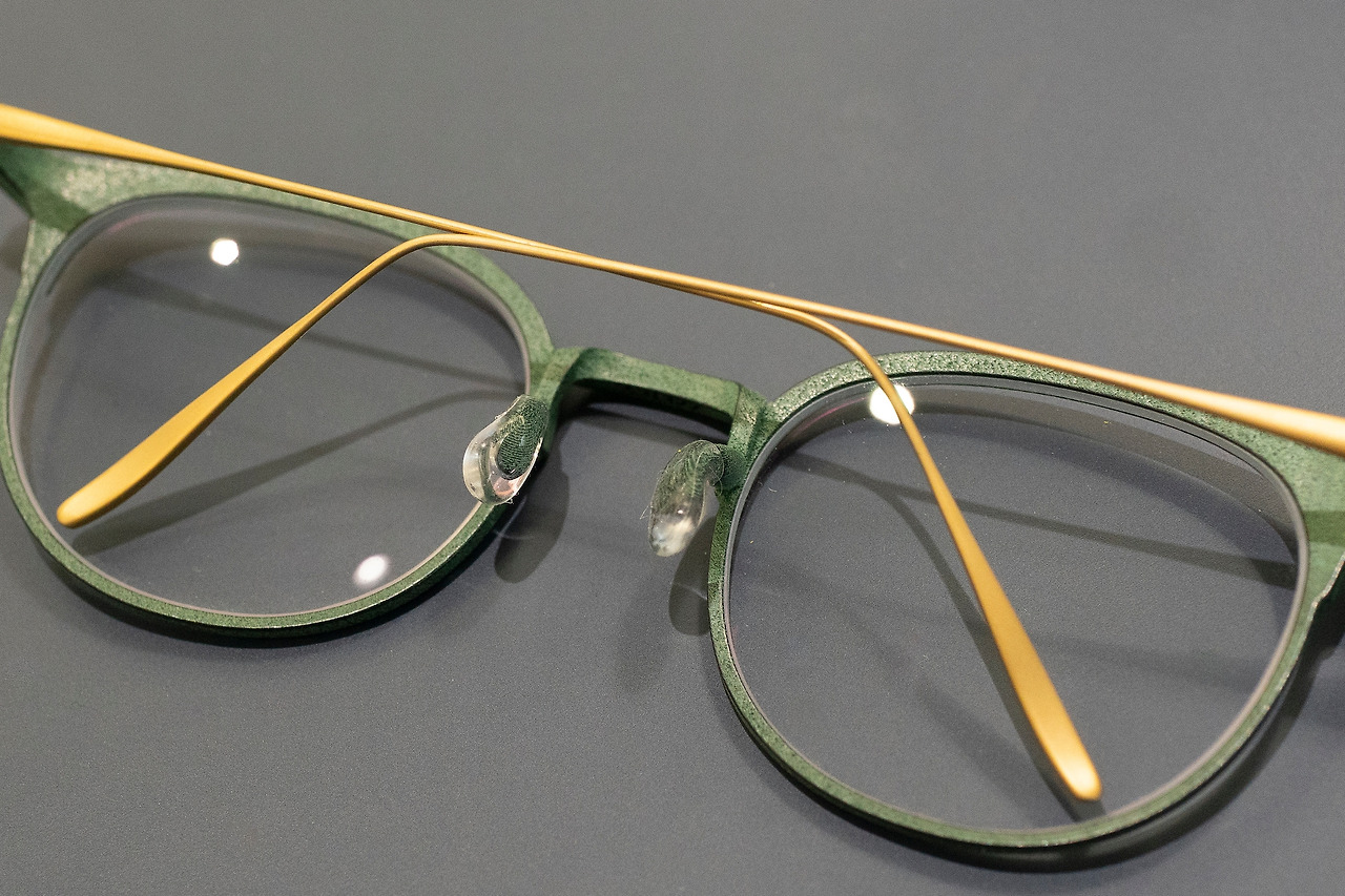 테는 흔히 이야기하는 뿔테와 티타늄 금속 테 두 가지가 있는데요. 뿔테는 앞면만 3D로 사출한 폴리아미드 재질이고 다리 부분은 금속입니다.