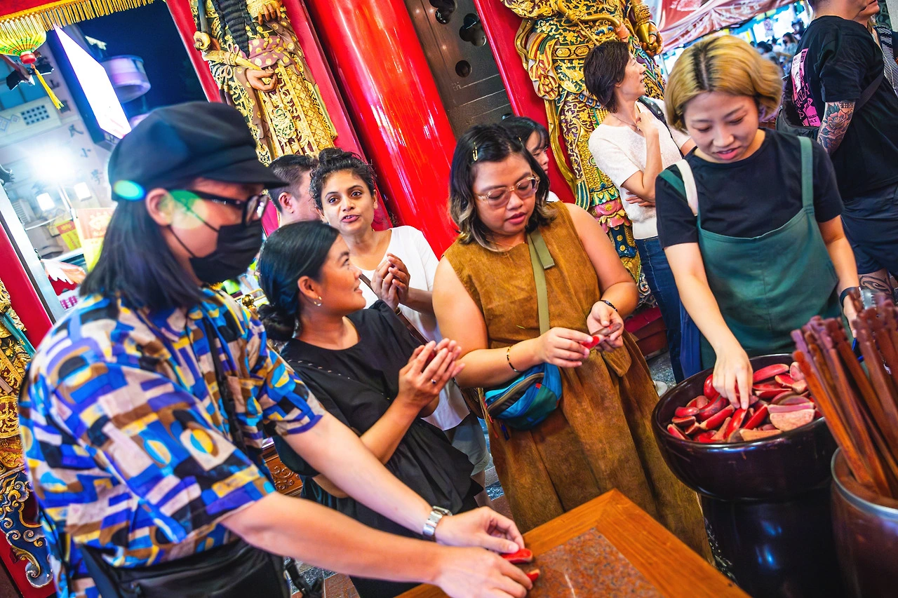 200년 전인 1753년에 지은 곳으로 도교에서 바다를 관장하는 마조(媽祖, Mazu) 여신을 모신 이곳은 원래 이 일대가 어시장이라 생긴 사원이라 하대요. 사당에 들어가니, 참가자들이 중국 문화권 사람들이 많아서 그럴까요? 체크인하며 인사를 나눈 참가자들이 기도를 드리거나 사당을 구경하고 있었어요. 저도 잠시 안을 구경하며 짙은 향냄새를 맡다 일행과 함께 오늘의 최종 목표인 ‘라오허제 야시장’으로 향했습니다.