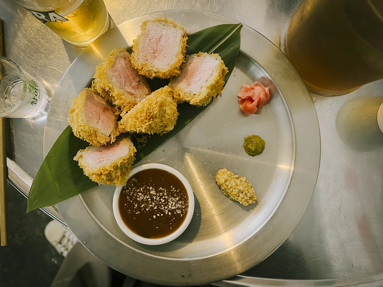 Six pieces of hirekatsu, each the size of a small egg, plated neatly with demi-glace sauce, whole-grain mustard, wasabi, and pickled ginger. I took a sip of soju, sliced into the crispy cutlet, dipped it deep into the sauce, and took a bite. Tender pork, light coating — it lived up to its popularity.
