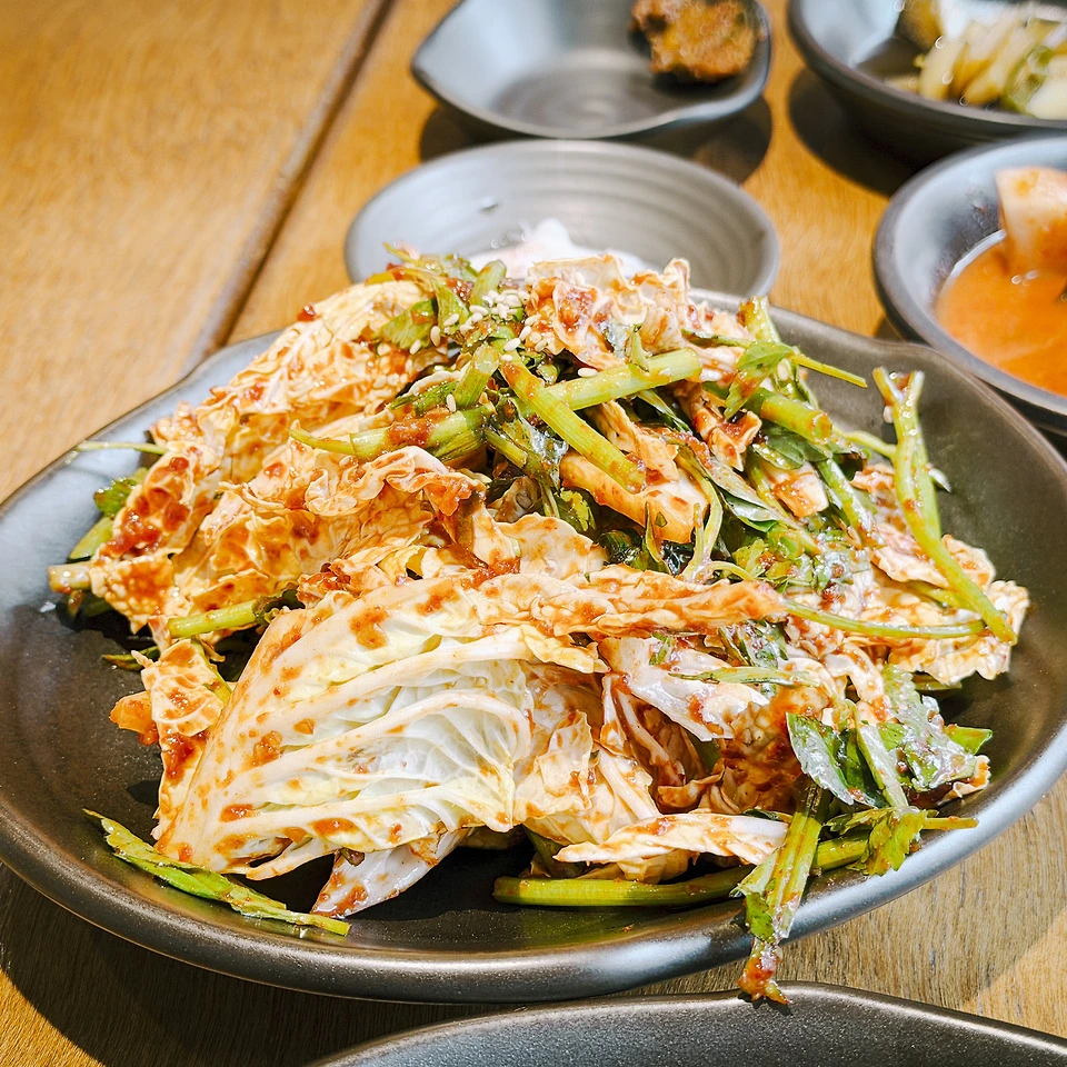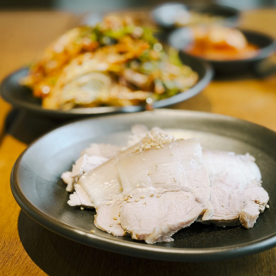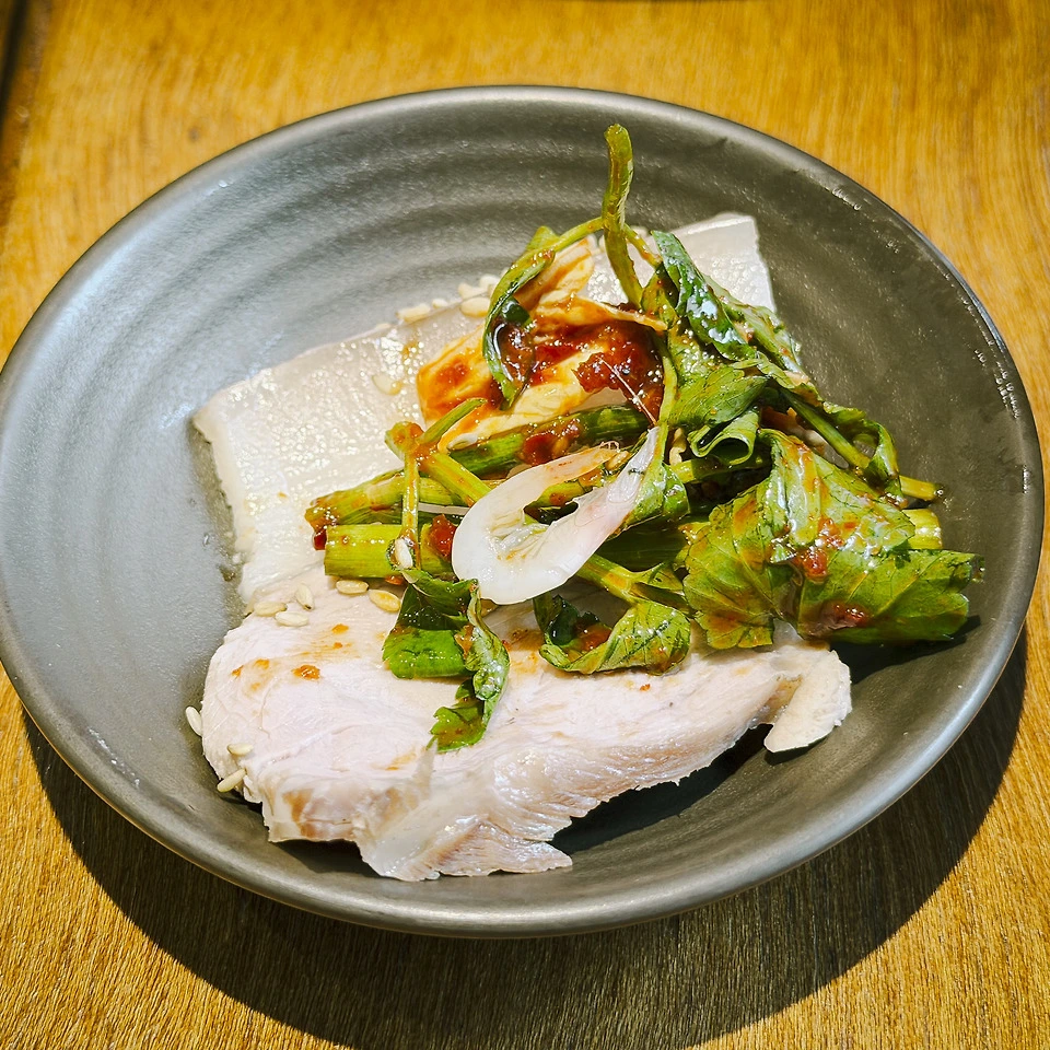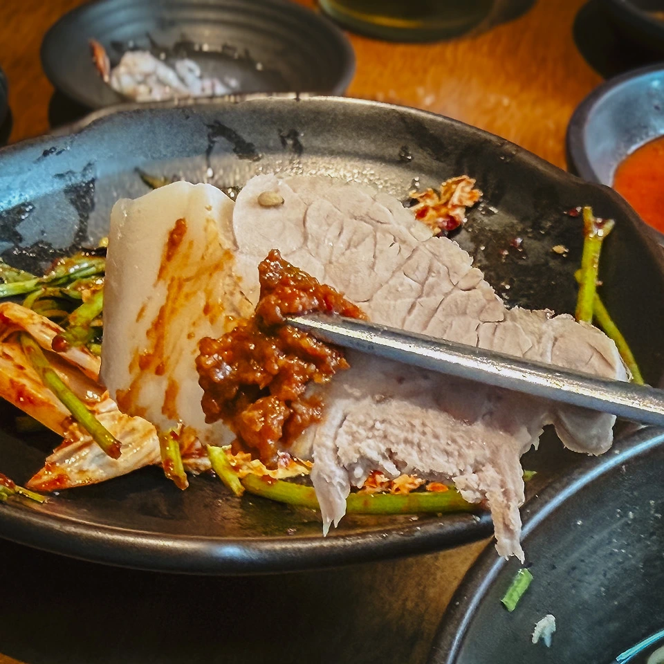 종업원 분에게 물어보니, 미나리 무침을 얹고 거기에 쌈장을 조금 바른 후 새우젓의 새우 하나를 얹어 먹어 보란다. 음… 음? 음! 와… 이거 왜 이렇게 맛있고 부드럽지? 앞다릿살로 삶은 냉제육은 보통 뻑뻑하지 않으면 연육제를 섞어 물렁한데, 온고 식당의 냉제육은 딱 절묘하다. 적당히 식감이 있으면서 질기지도 않은, 딱 좋은 그 맛? 이거 큰일 났다. 한 7~8점이 나오는데 한 점이 거의 명함 한 장 정도 크기. 나 같은 입 짧은 녀석은 반 쪼개 먹으면 적당하다.