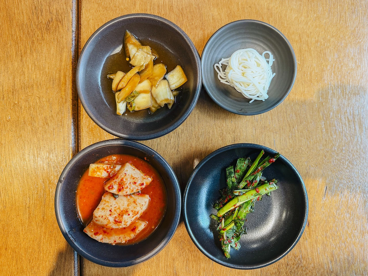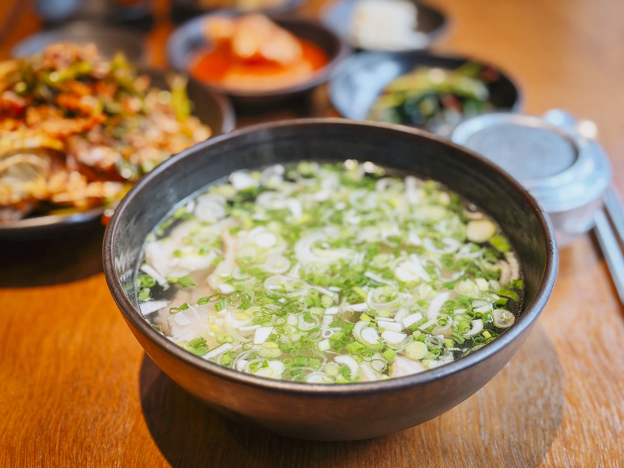 점심시간에 얼른 자리 잡고 돼지곰탕과 냉제육 반 접시를 시켰다. 먼저 기본 찬은, 클리셰 수준으로 흔하다. 섞박지에 양파절임, 산에서 자란 두메부추 무침에 소면이 끝. 정갈하긴 한데 빈약하다고 생각할 수도 있고… 그런데 뭐, 국밥이 그렇잖아. 국물로 먹는 거니까?