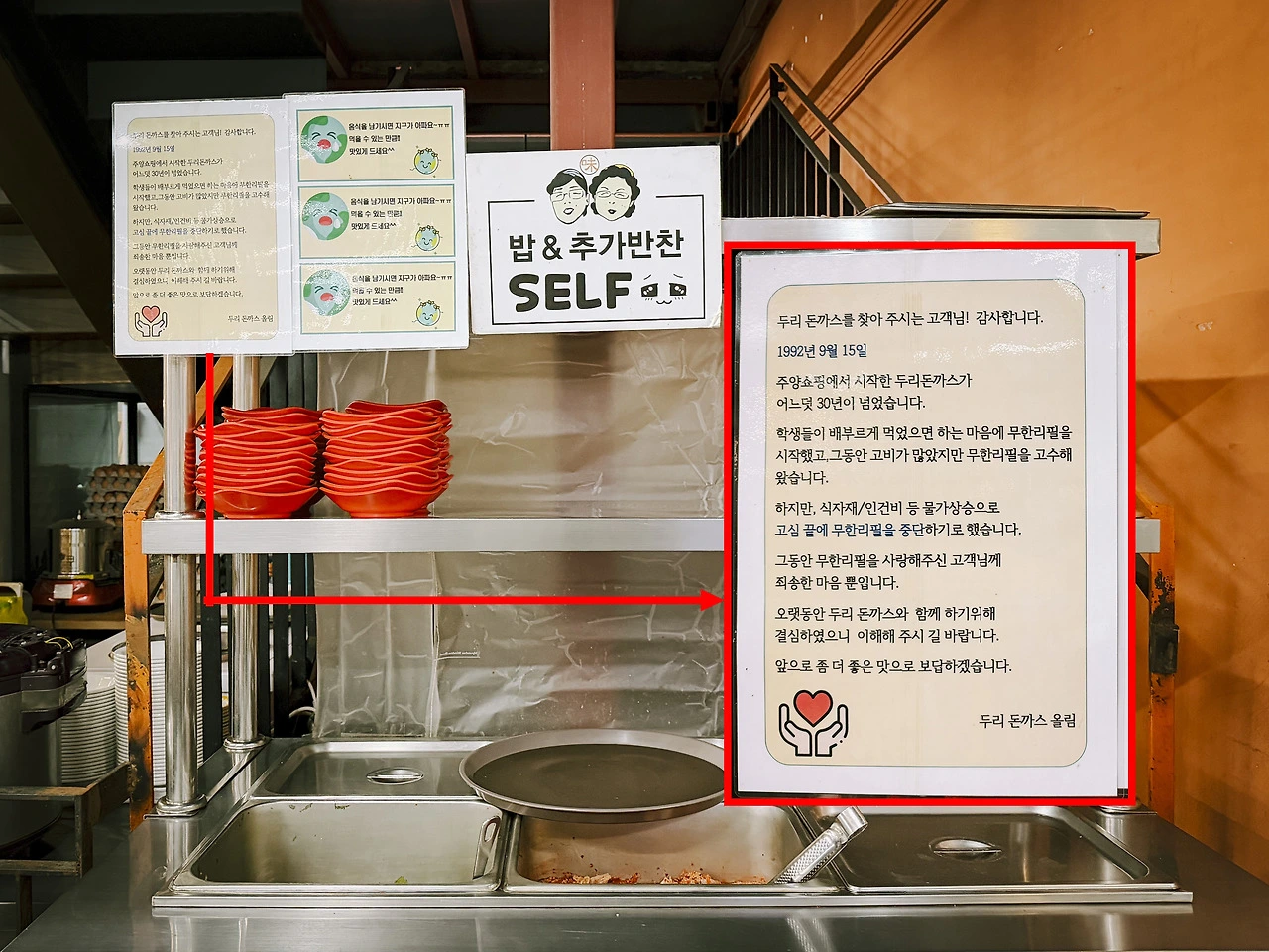 어렸을 때부터 워낙 자주 먹다 보니 두리 돈까스는 내가 기억하는 돈까스 맛의 표준이 되었다. 전국 어디서 돈까스를 먹어도, 평생 난 ‘두리 돈까스에 비하면 여기는 ***하네!’ 이렇게 비교하게 될 거다. 얼추 병이 비어 가고, 물김치를 리필하러 셀프바에 가 보니 이런 문구가 붙어 있다.