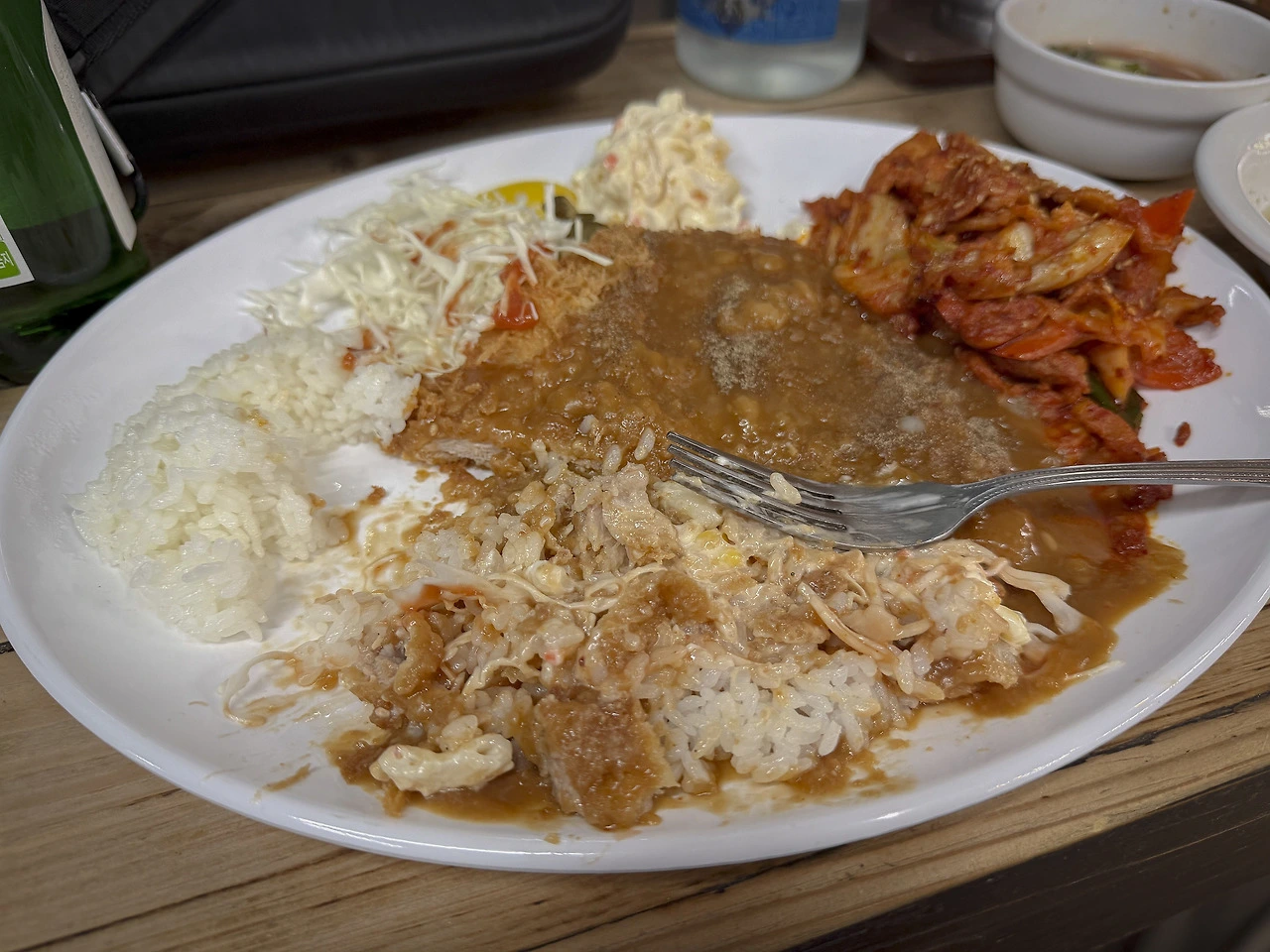 Yeah… there’s no resisting this. Time to order a bottle of soju. There might’ve been soup dishes on the menu, but who needs them? A bite of pork cutlet, a forkful of water kimchi, and a sip of broth—it all works out.