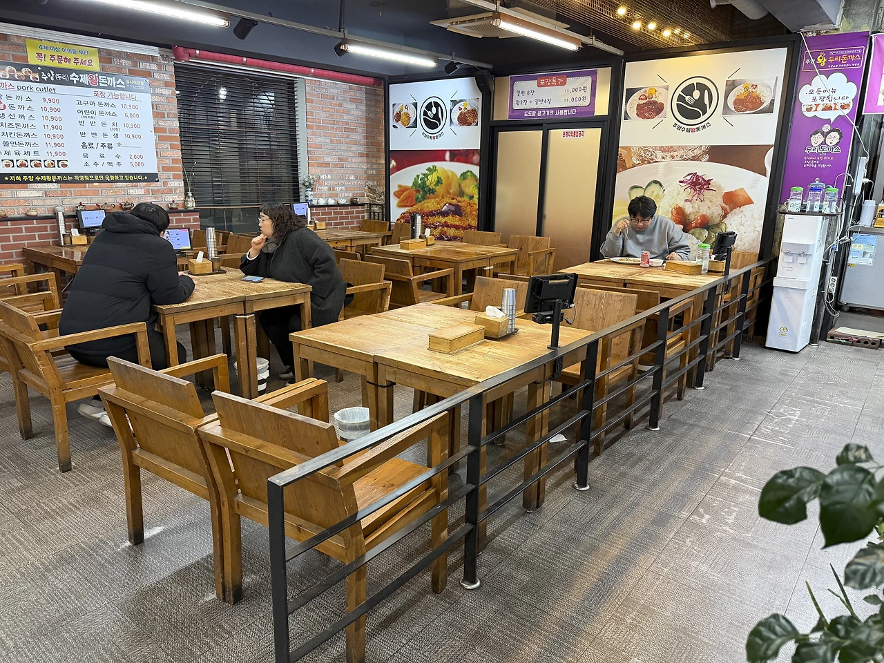 가게 문을 열고 들어가 보면 공간이 꽤 크다. 4인용 테이블이 6개 정도, 혼밥 테이블이 7개 정도 보이고, 또 다른 공간에도 4인용 테이블이 많이 들어가 있다. 주방을 둘러싼 다찌 테이블밖에 없던 예전 두리 돈까스에서는 바로 “돈까스 둘이요~” 주문했지만, 이젠 여기도 키오스크가 있다.