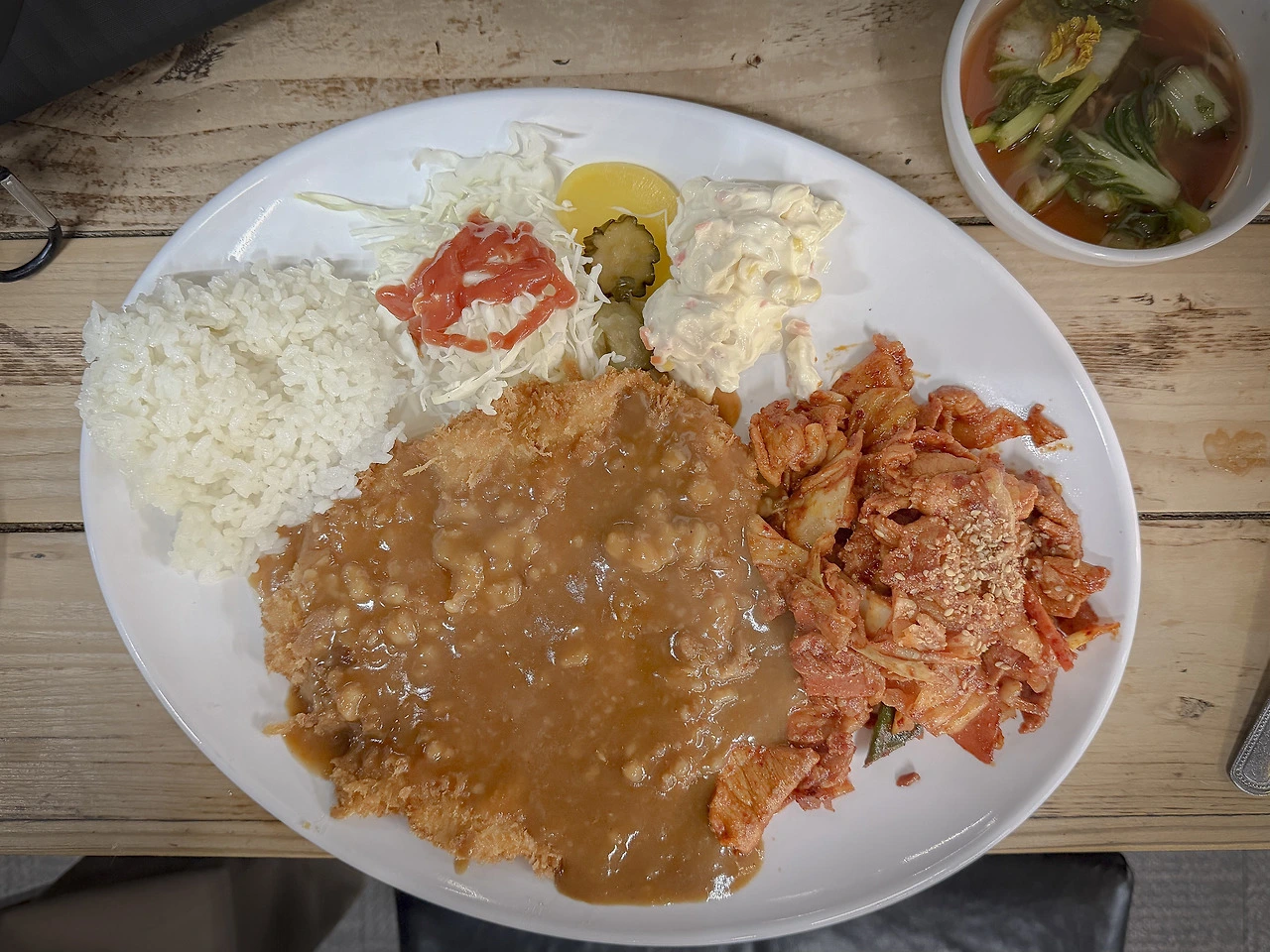 스프에 후추 후추 해서 먹고 있다 보니 금세 돈까스+제육 메뉴가 나온다. 아… 이거 보니 못 참겠네. 얼른 소주를 시키자. 국물 메뉴도 있었던 것 같은데, 뭐 따로 필요 없다. 돈까스를 먹다 물김치 한 젓가락 푹 집어 먹고 국물 마시면 되지 않나?!