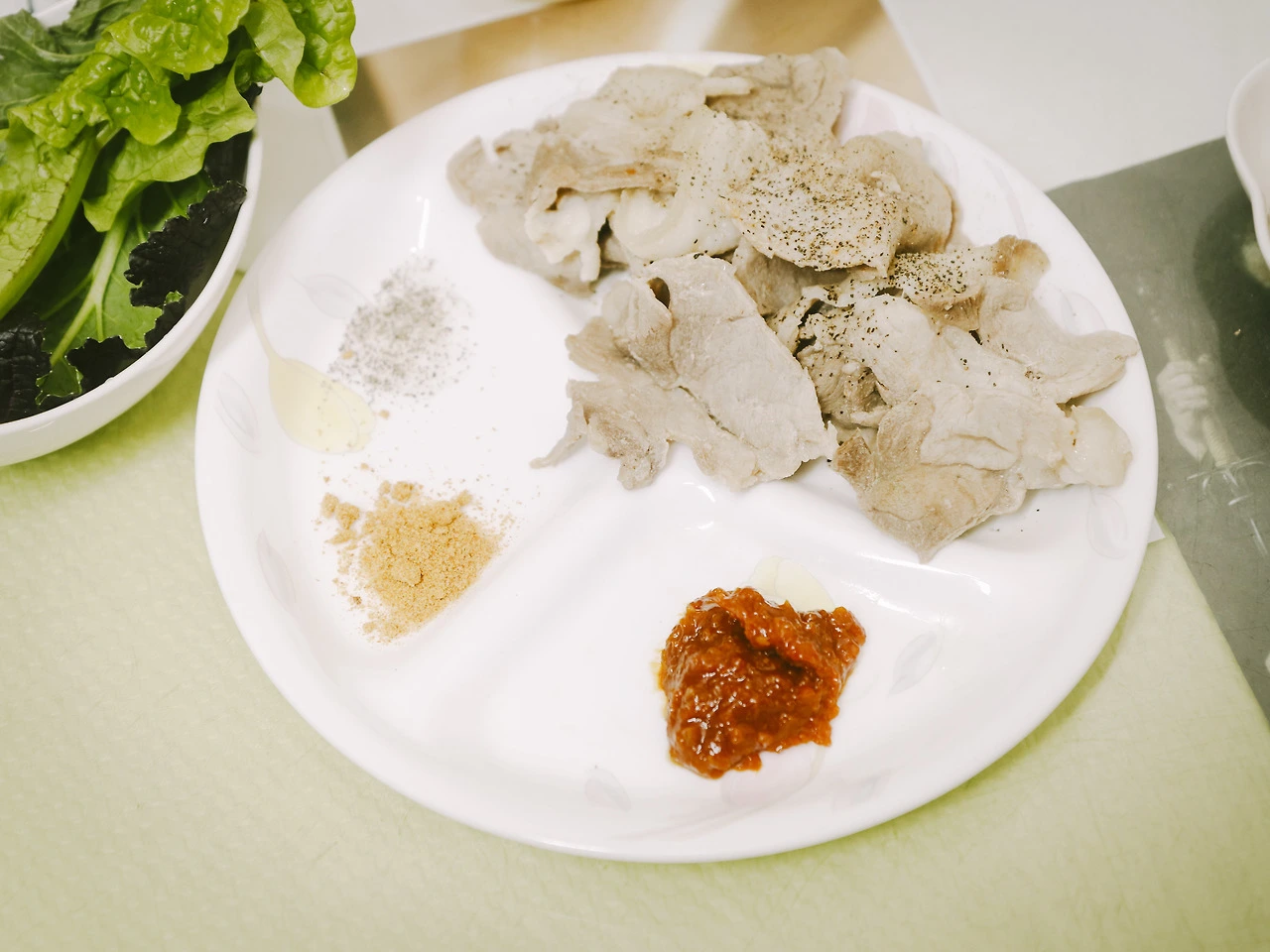 소스는 뭐 별거 없다. 후추+소금에 쌈장, 얼마 전 사 놨던 타코 시즈닝이면 되지 뭐. 마침 먹고 남은 쌈 채소가 있어서 같이 곁들여 봤다.