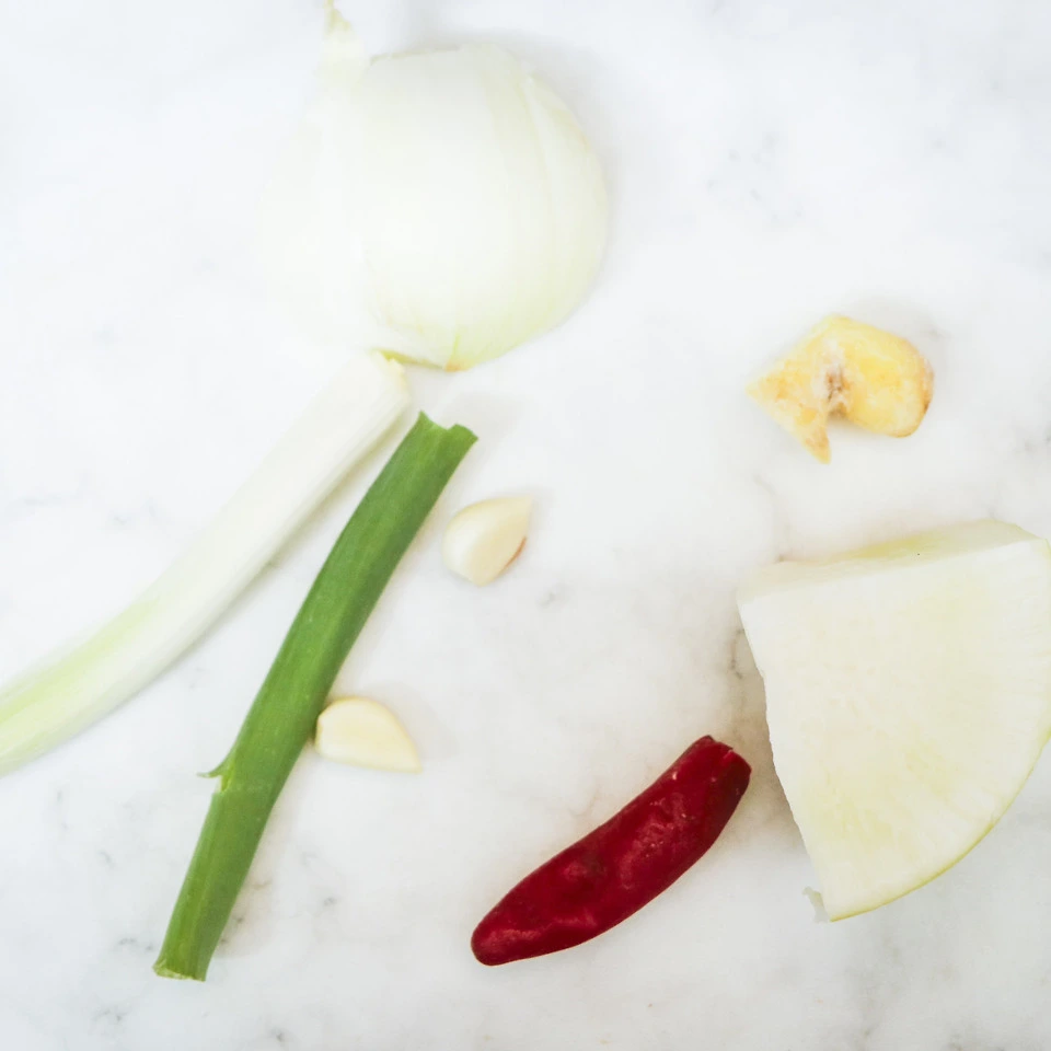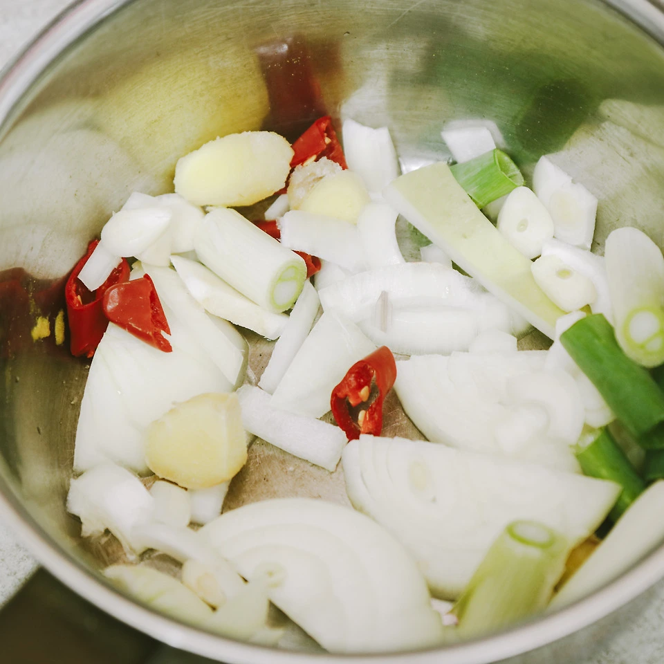 냉동고에는 얼마 전 먹고 남은 슬라이스 전지 반 근 정도가 남아 있다. 냉장고를 털어보니 에어팟 두 개 정도의 무 조각과 양파 반 개, 마늘 두 알과 생강 엄지손가락 반만큼, 연필만 한 파 조각 두 개, 그리고 홍고추가 있더라.