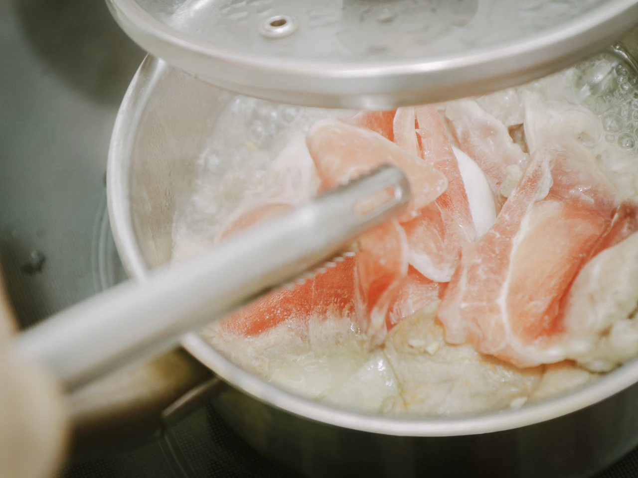 종이컵 하나 정도의 물을 붓고 팔팔 끓어오르면, 깔아둔 무 위에 슬라이스 전지를 올리고 뚜껑을 닫아준다.