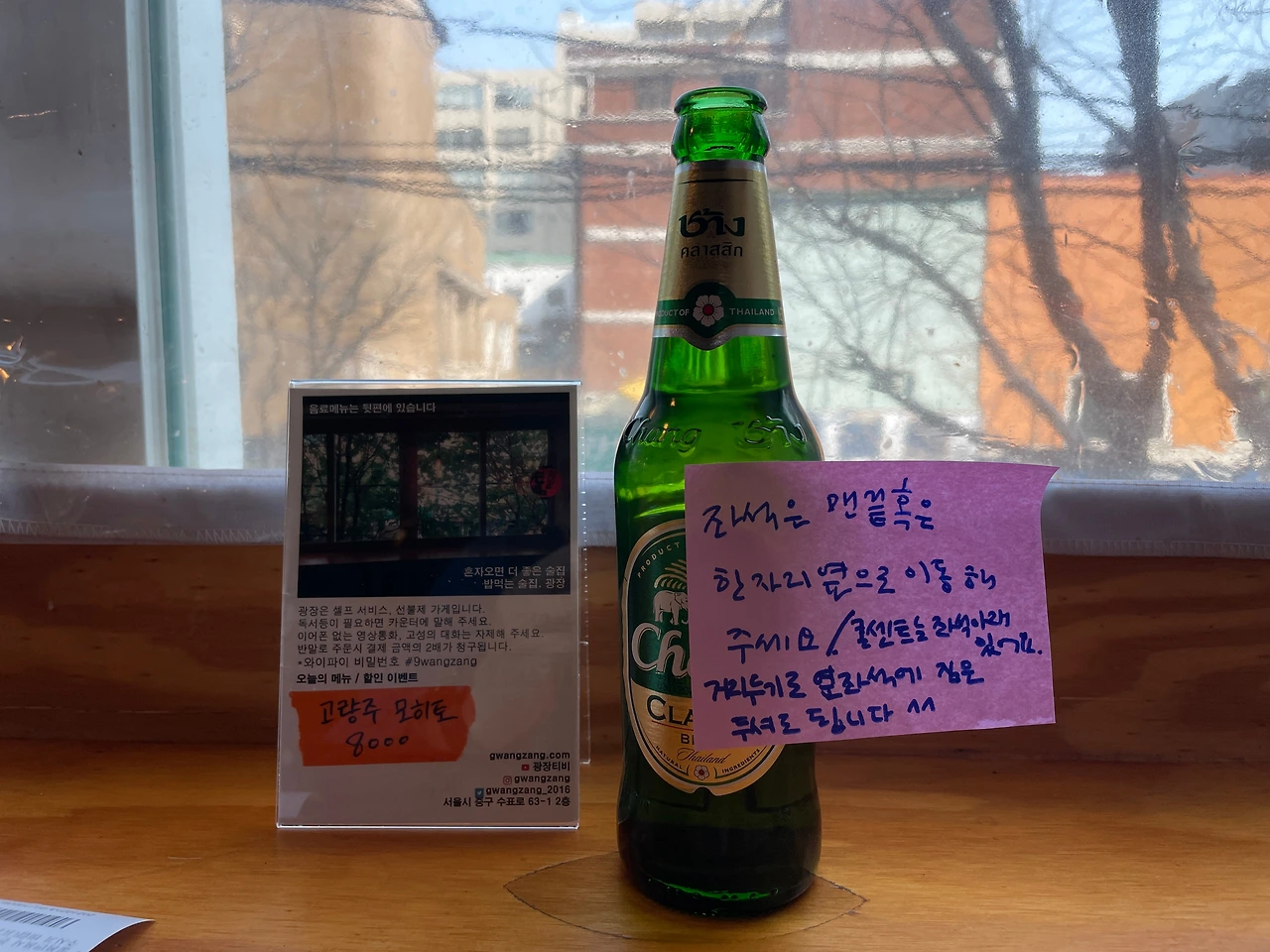 좀 서성거리다 문득 불이 켜진 2층 가게 ‘밥 먹는 술집, 광장’? 일단 한 번 올라가 보니 생각보다 넓은 카페 형식의 테이블. 주인은 잠시 어디 간 건가… 잠깐 자리에 앉아 서성이고 있으니 주인이 포스트잇으로 메모를 건넨다. 잘 살펴보니 이곳은 말이 없는 가게란다. 요즘 같은 코로나 시대에 딱이구만.