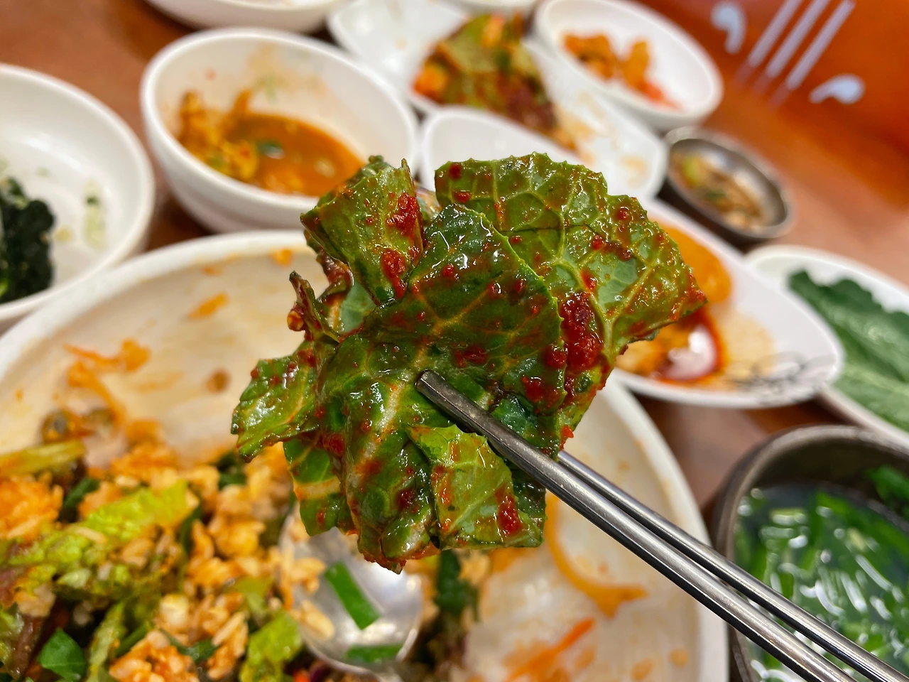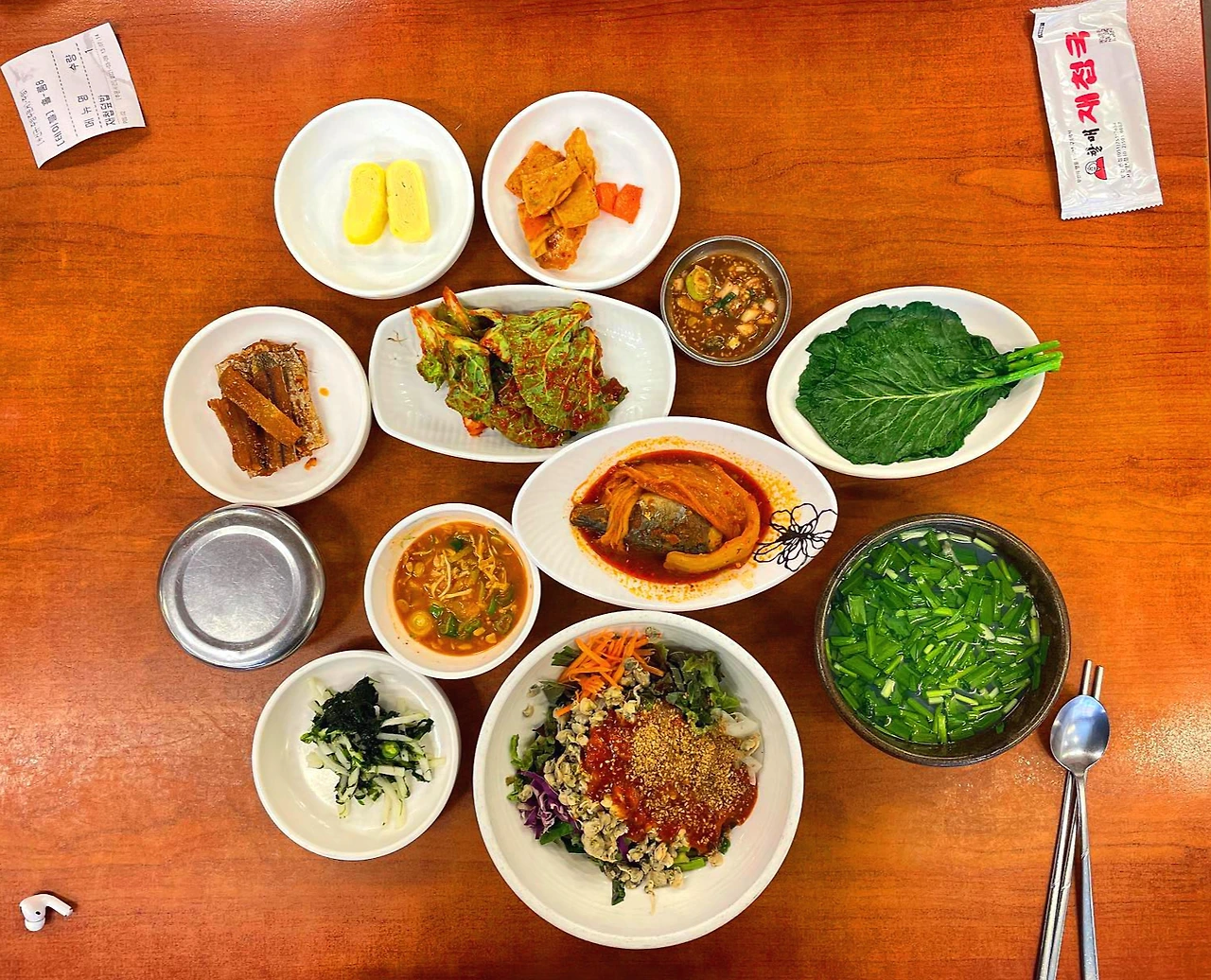 보통 이렇게 맛이 진한 음식에는 슴슴한 찬이 나오게 마련인데 경상도 스타일은 강한 데는 강한 걸로 맞서나? 향긋하다 못해 바다 내음 풀풀 나는 파래 무침, 짭짤하고 시원한 봄동 겉절이, 짭짤한 고등어 김치 조림에 멸치젓과 강된장이 찬으로 나온다. 슴슴한건 계란말이와 오뎅볶음 뿐.