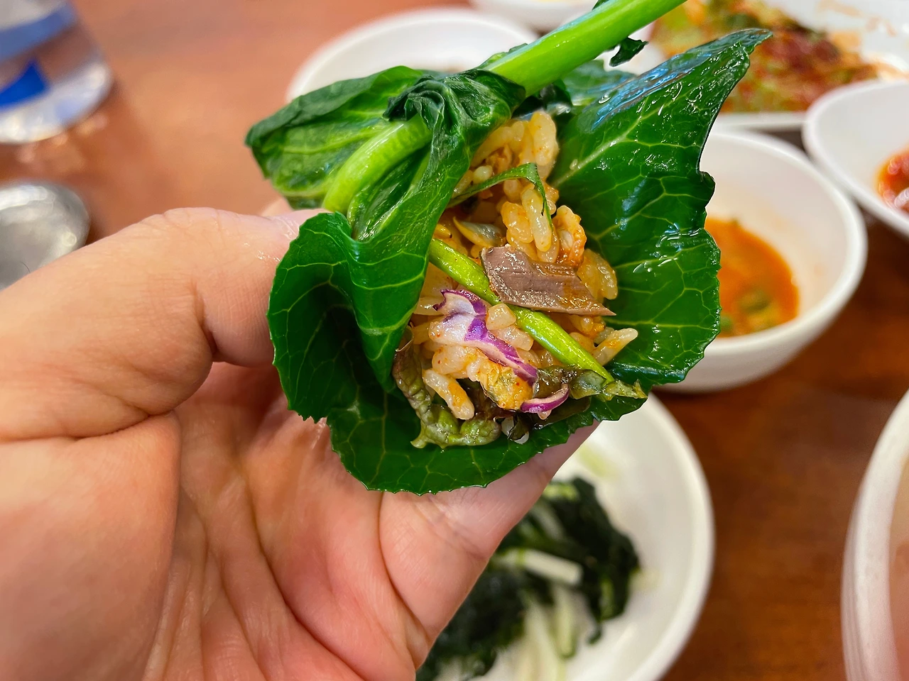 멸치젓은 돼지고기 먹을 때 빼곤 잘 먹지 않아 패스. 꼭 호박잎 같은 찐 케일 잎에 밥을 넣고 강된장을 조금 넣어 먹으니 별로 짜지도 않고 좋다. 이때 풀치 조림도 하나 뙇~ 건더기가 많이 들어간 덕분에 끝까지 재첩 식감이 나서 한 그릇 다 비울 때까지 즐겁게 먹을 수 있었다.