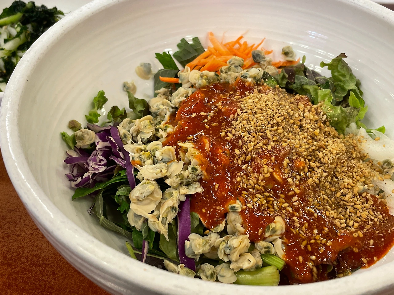 재첩 정식이 각종 나물에 국에서 재첩 건더기를 건져내 넣어 밥을 비벼서 반찬과 함께 먹는 스타일이라면 재첩 덮밥은 나물 없이 양배추와 미나리, 깻잎, 당근 등 신선채소를 넣고 그 위에 재첩을 밥공기로 반은 넘게 얹어낸 건더기에 초장 넣고 싹싹 비벼 밑반찬과 재첩국을 곁들여 함께 먹는 그런 ‘너낌적인 너낌’. 햐… 갱상도 음식에 요 말 쓰니 챡 붙네.