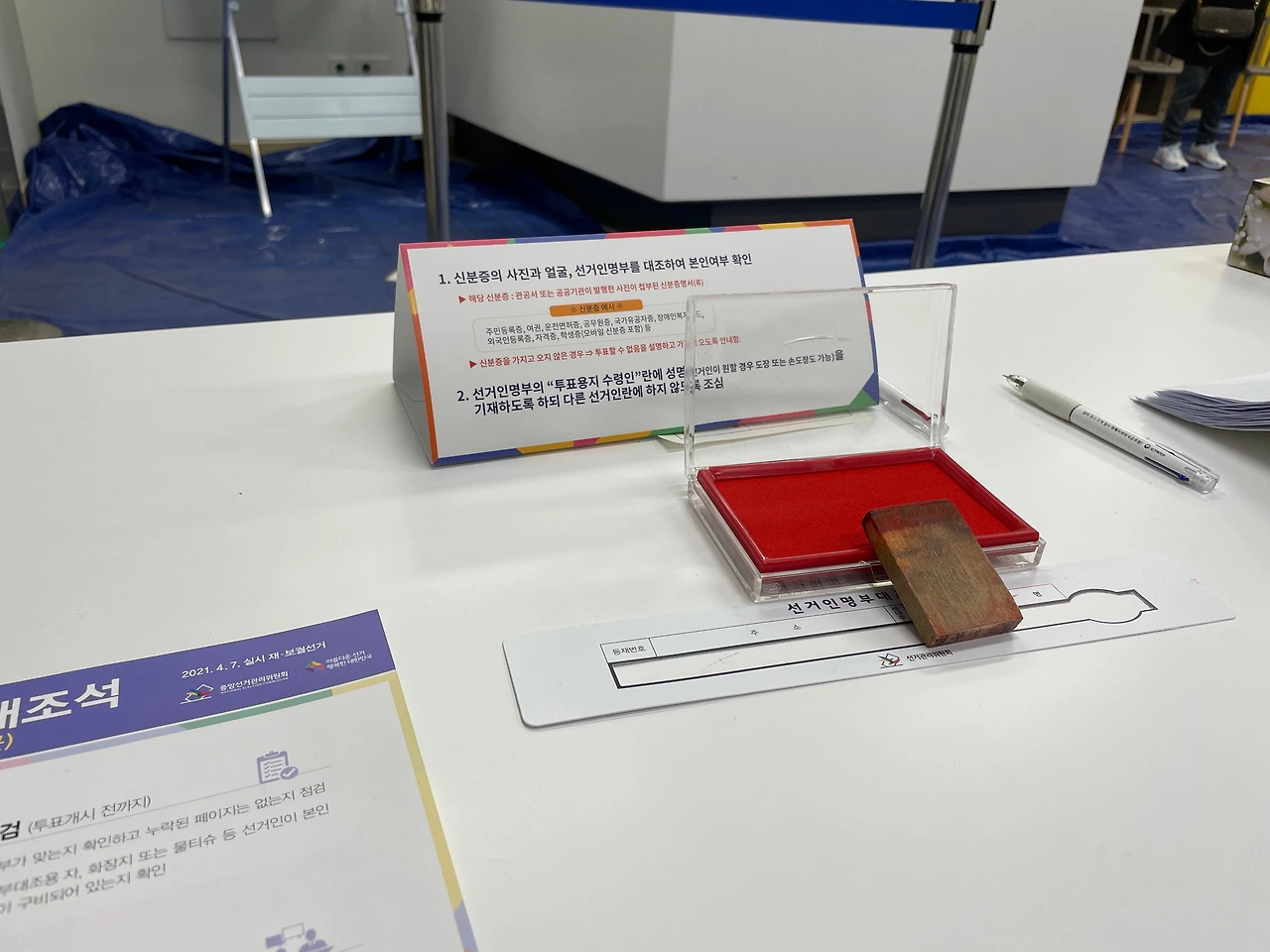 신분증 얼굴 확인이 끝나면 다시 한 번 신분증의 내용을 체크한 후 ‘내가 확실하다’는 증거로 선거 인명부에 서명을 하게 된다. 이때 서명은 한글자 한글자 정자로 쓴 이름이나 도장. 지장만 되고 사인은 불가능한데, 미리 설명을 해도 그렇게 사인을 하겠다고 우기는 사람들이 있다. 어떤 분은 ‘선생님 이름 정자로 쓰세요’ 했더니 서명 란에 ‘정자로’라는 글자를 또박 또박 크게 적어넣더라. 거참…. ‘아뇨 선생님 찍찍 긋고 정자로요’ 하니까. 바를 正자를 쓰는 분도 계시더란…