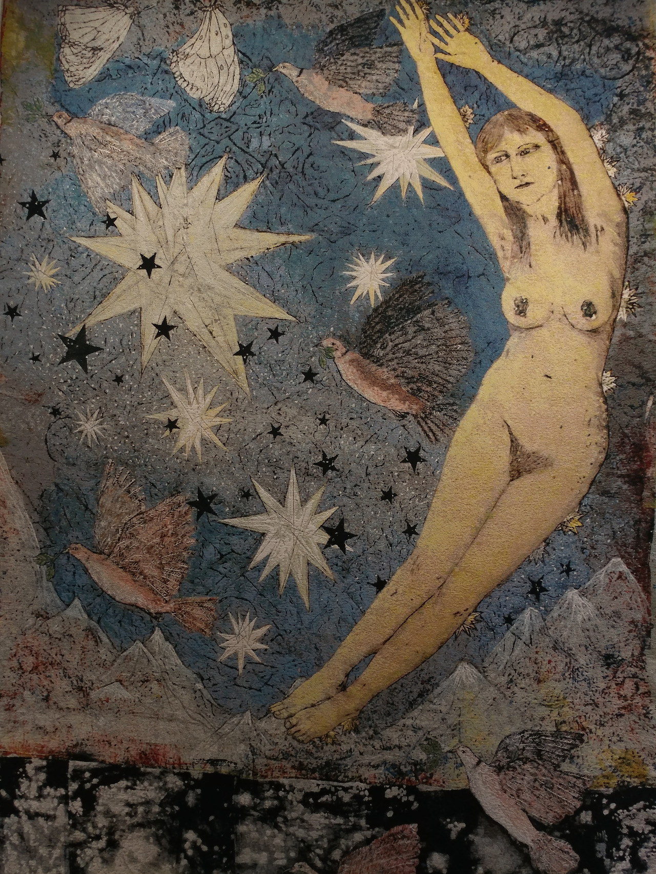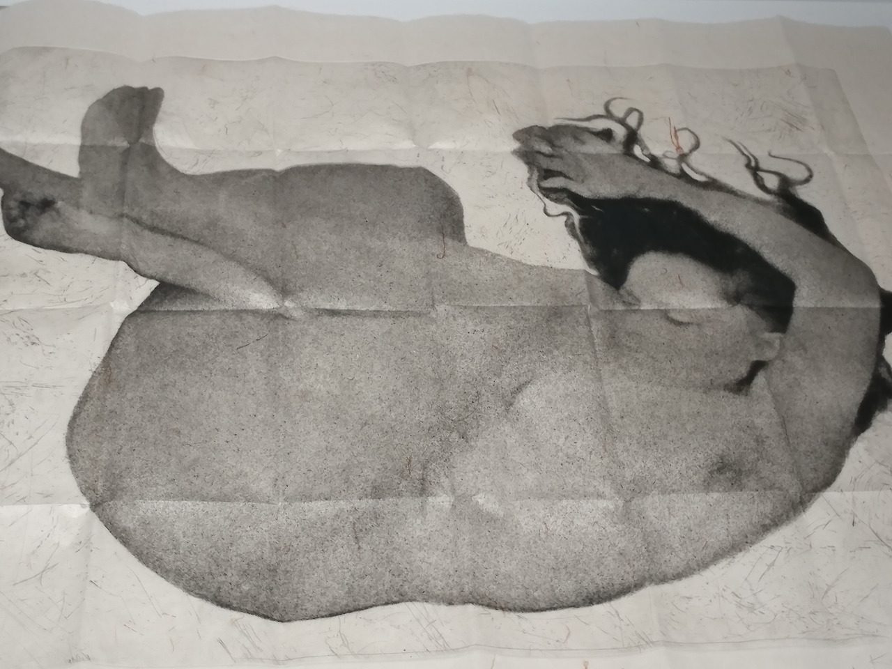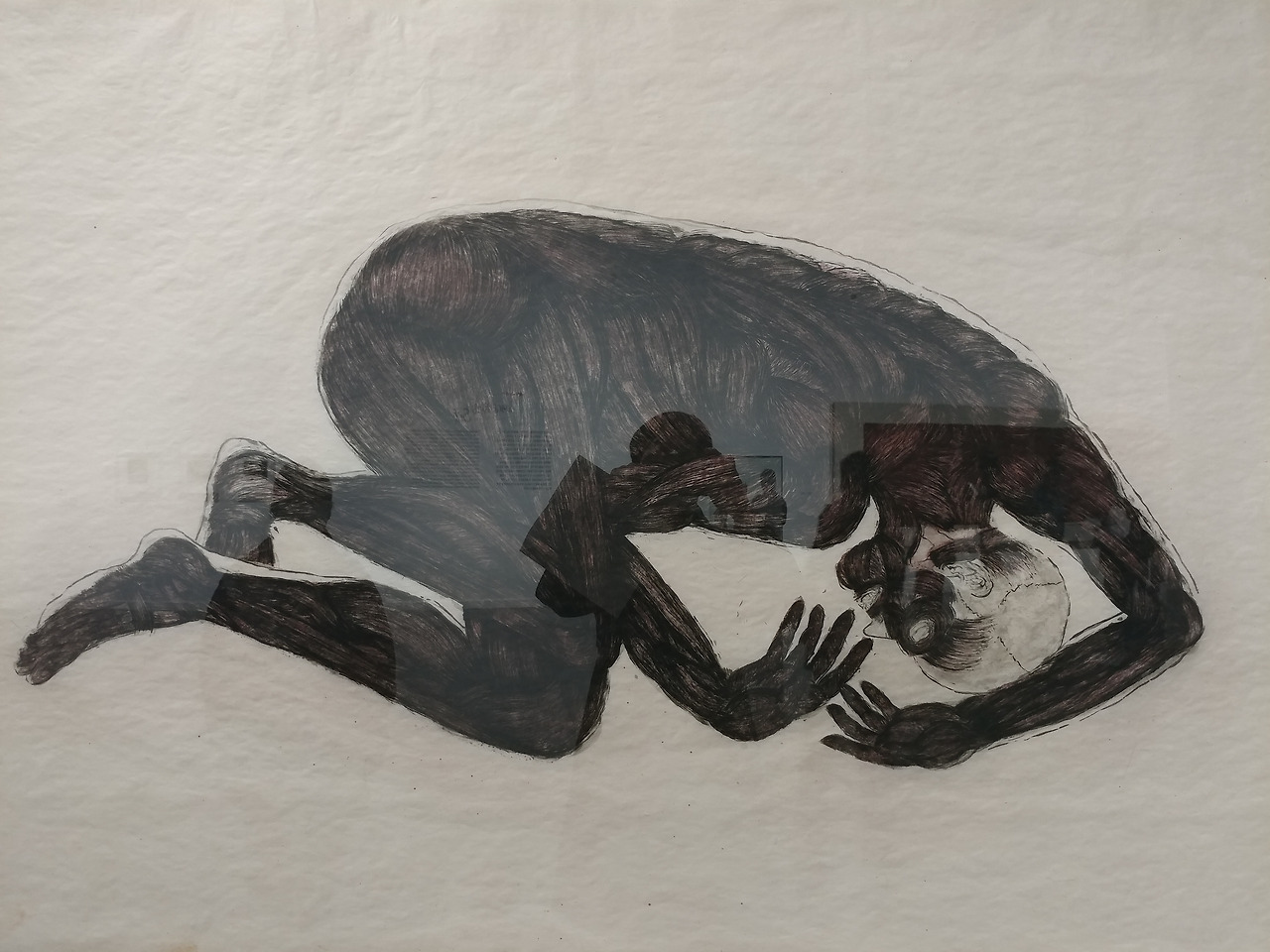 이름이 좋다. 자유낙하. 떨어지면 그 끝은 어떻지? 오랜 작품 활동을 해온 동료예술가들을 존경하게 되면서 자기도 그렇게 살고 싶어서 높은 곳에서 떨어지는 듯한 여성의 모습을 판화로 찍어낸 작품. 판화였구나. 낙하를 통해 그녀가 표현하려는 의도는 낙하 그 자체가 중력의 법칙이 작용하는 지구에서의 현실, 이게 인간이 갖는 필연적인 조건을 수용하는 것. 더불어 "이상과 기념비가 아닌 죽음을 앞둔 인간 조건의 깨달음"을 표현한 것이라고 한다.