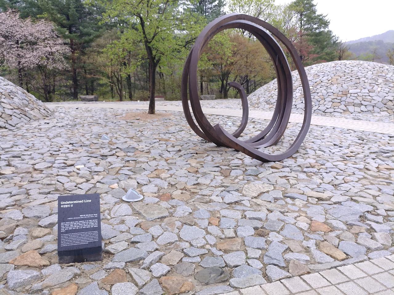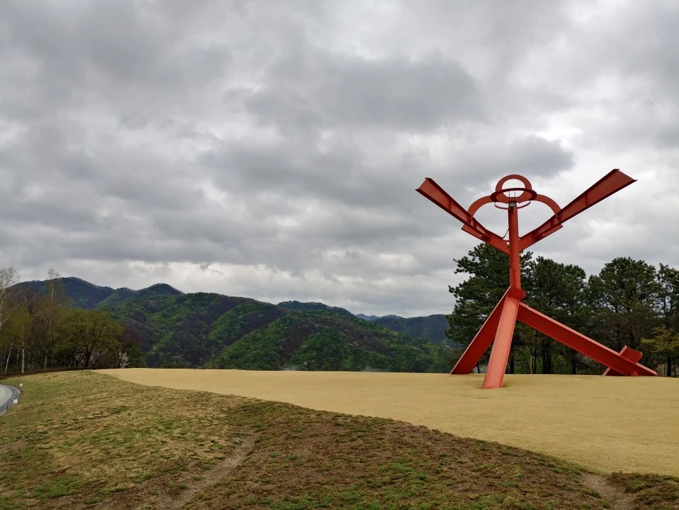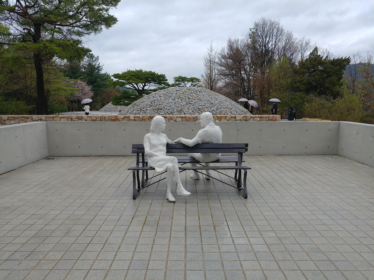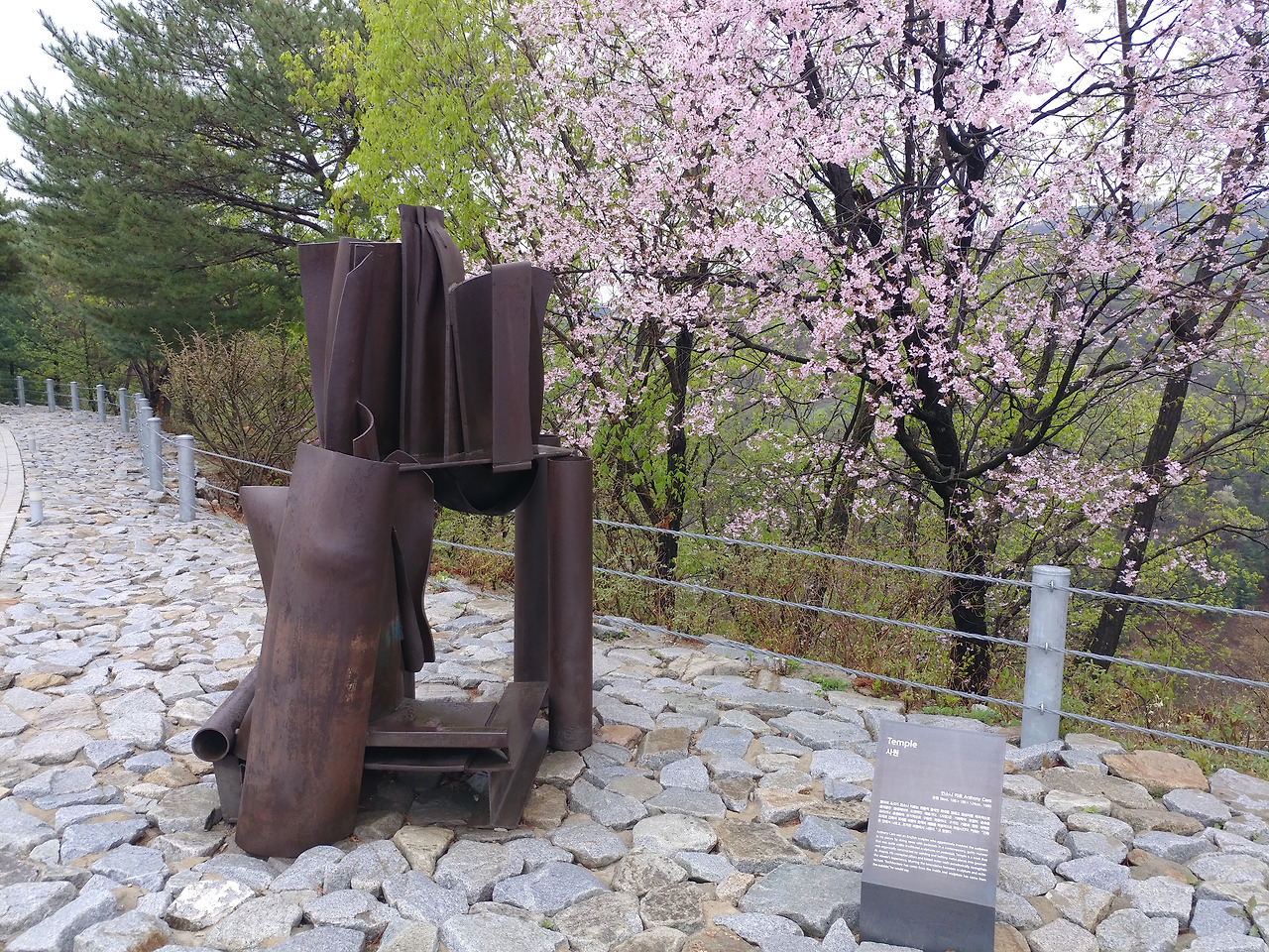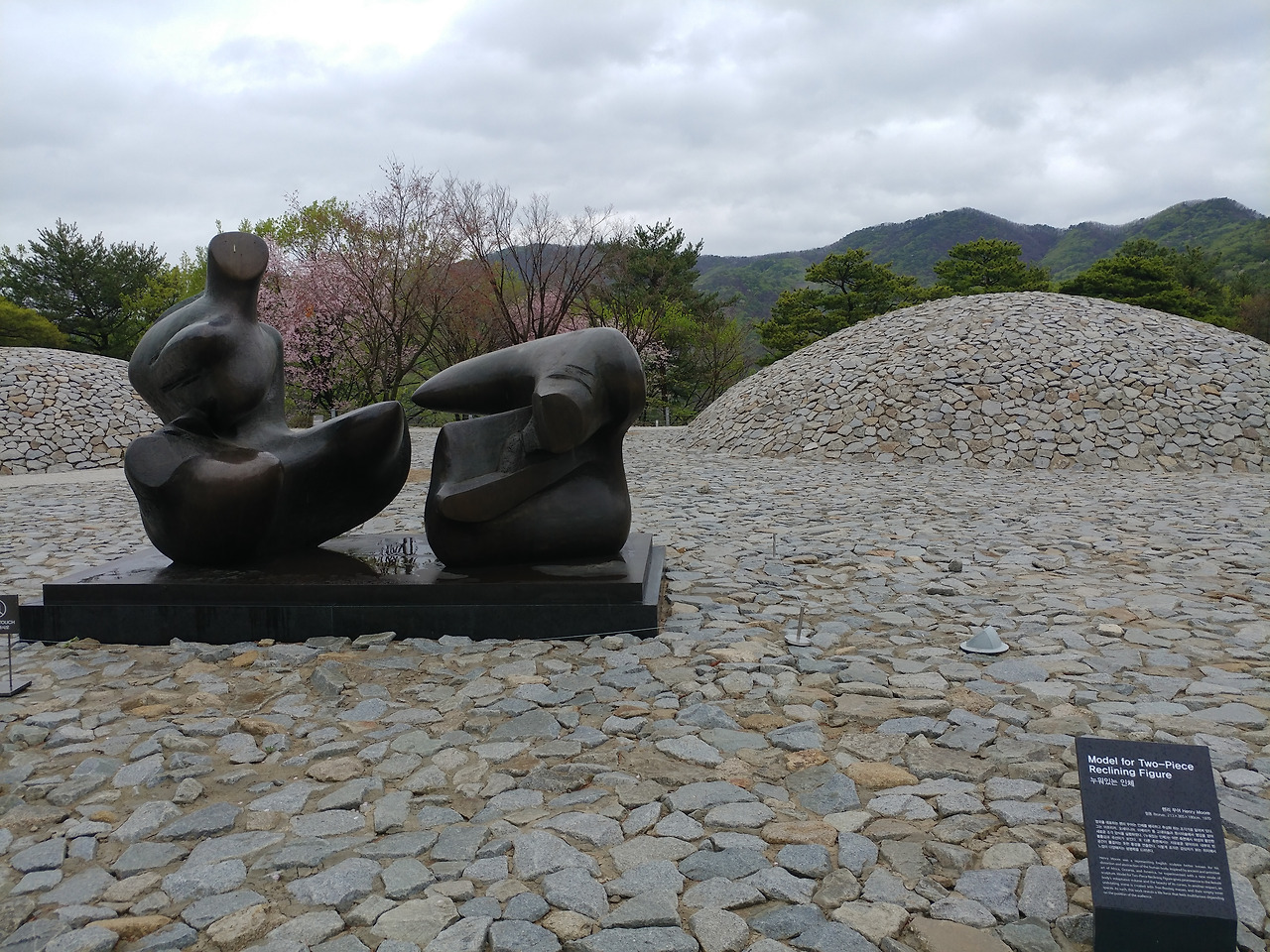 그렇게 청조갤러리를 둘러보다 보면 한쪽으로 밖에 나갈 수 있다. 이곳을 통해 스톤 가든에 갈 수 있다. 입구에는 조지 시걸의 '두 벤치 위의 커플'이란 작품이 있는데, 이건 어떤 의도였을까? 총 9개의 스톤 마운드 사이로 베르나르 브네의 ‘부정형의 선,’ 헨리 무어의 ‘누워 있는 인체,’ 안소니 카로의 '사원' 등. 곳곳 포인트에 작품들을 배치했는데, 이는 단조로움을 극복하려는 목적이라고 한다. 그 너머 왼편 끝 쪽에 제임스 터렐 전시관이 있고, 스톤 가든 입구 오른편 앞쪽에 명상센터가 있다.