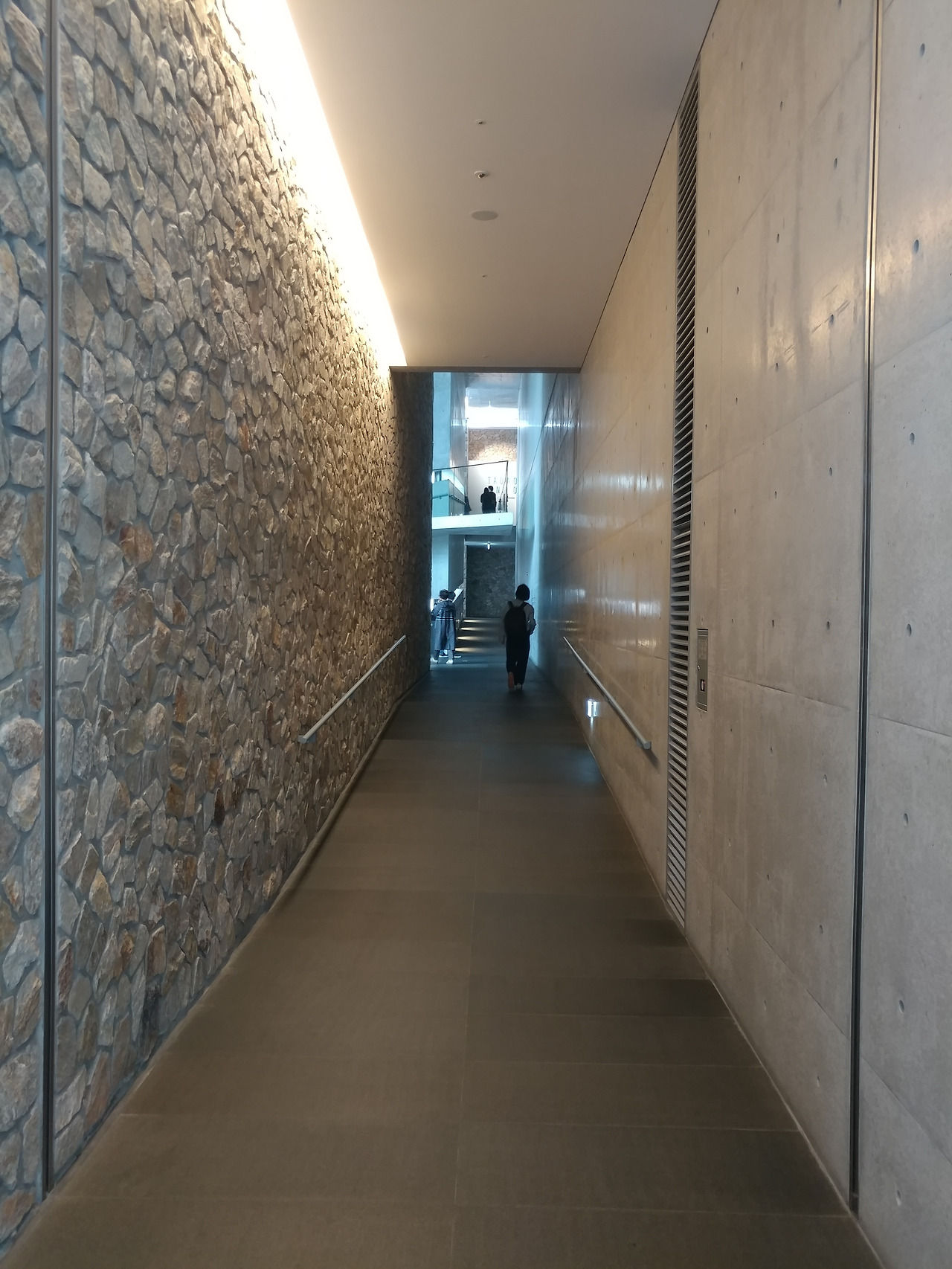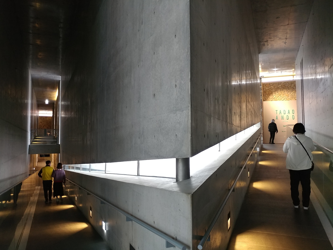 콘크리트가 조화로운 본관 건물. 내부를 들여다보면 한쪽에선 노출 콘크리트만 다른 한편엔 파주석만 사용하기도 했다. 그럼에도 건물에 빛이 들어오도록 했다. 어떤 면에선 건물 내부에서 노출 콘크리트가 더 눈에 띈다. 그 복도는 아주 좁게 설계했고, 천장은 상당히 높게 만들었다. 천장에도 역시나 자연스럽게 빛이 들어오도록 했다. 물론, 건물 옆면으로부터도 빛이 조명이면서 장식이 되게 만들었다. 일부 벽면 아래에 유리 벽을 만들어 관람객으로 하여금 답답하지 않게 만들었으며, 그 밖에는 물을 배치함으로써 빛이 물에 반사되어 건물 안으로 들어오도록 했다.