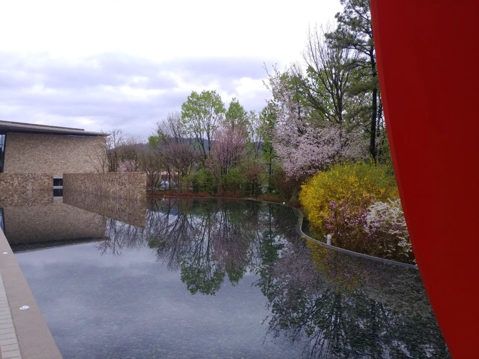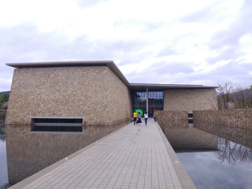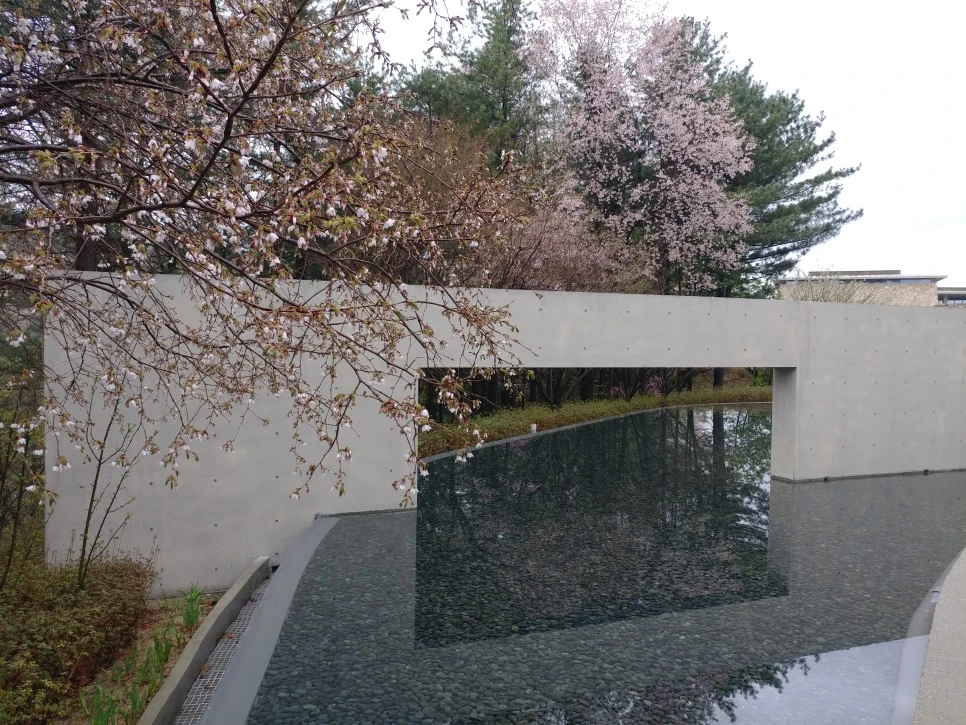 물 위를 걷는 듯한 느낌을 주면서도 그 느낌을 단번에 날리는 조형물이다. 사람들이 여기선 순한 양이 된다. 사진을 찍는 관람객들을 기다려주는 아량이라니. 뮤지엄 산의 상징 같은 조형물? 안도 타다오가 노린 것이 바로 이런 것일까? 양옆으로 펼쳐진 물 위로 봄꽃과 빛이 서로 조화를 이루는데, 여기엔 파주석으로 외관을 드러낸 본관 건물이 중심을 굳건하게 잡는다. 여기에 물속에 있는 검은 돌이 해미에서 가져온 돌이라고 하는데, 검은 돌의 목적이 물에 비친 사물이 더 드러나게 하는 것이라고 한다. 물이 반사하는 형상을 더욱 나타내준다니.