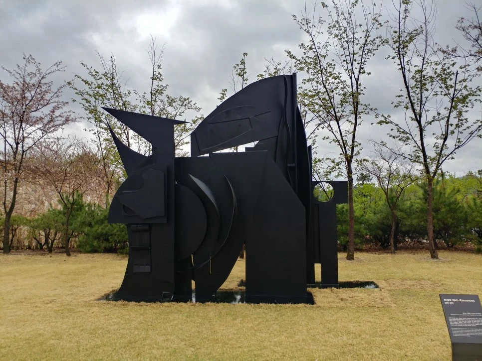 웰컴센터에서 표를 받아 나서면 플라워 가든이다. 붉은 패랭이꽃과 자작나무로 이뤄진 산책길을 걷게 만들어놨다. 5월에 패랭이꽃이 환상이라는데, 너무 일찍 왔다. 그곳에 들어서기 전에 오른편에 멋진 작품이 하나 눈에 띄었다. 사람들이 이곳을 그냥 지나친다. 섭섭해할까 봐 가보니 루이스 니벨슨(1976)이 만든 '밤의 장막'이란 작품이다. 웰컴센터에서 플라워 가든 오른편에 있는데, 관성이란 게 특이하다. 왼편으로 남들이 모두 가니 그저 따라간 것이다.