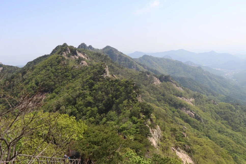 저 멀리 걸어온 능선이 아득하다. 삼불봉도 보이고.