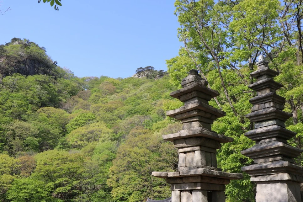 이상보(2006)가 쓴 《갑사로 가는 길》에서 언급되는 계룡산 동학사 남매탑. 그 탑에 어린 전설. 믿거나 말거나, 두 사람이 남매의 연으로 청량암을 짓고 같이 수도에 매달리다 서방정토로 떠났다고. 이를 믿는 사람이 얼마나 될까, 라고 물으면 너무 세속적일까? 오늘은 탑보다 탑 뒤로 보이는 신록이 아무래도 주인공이다.