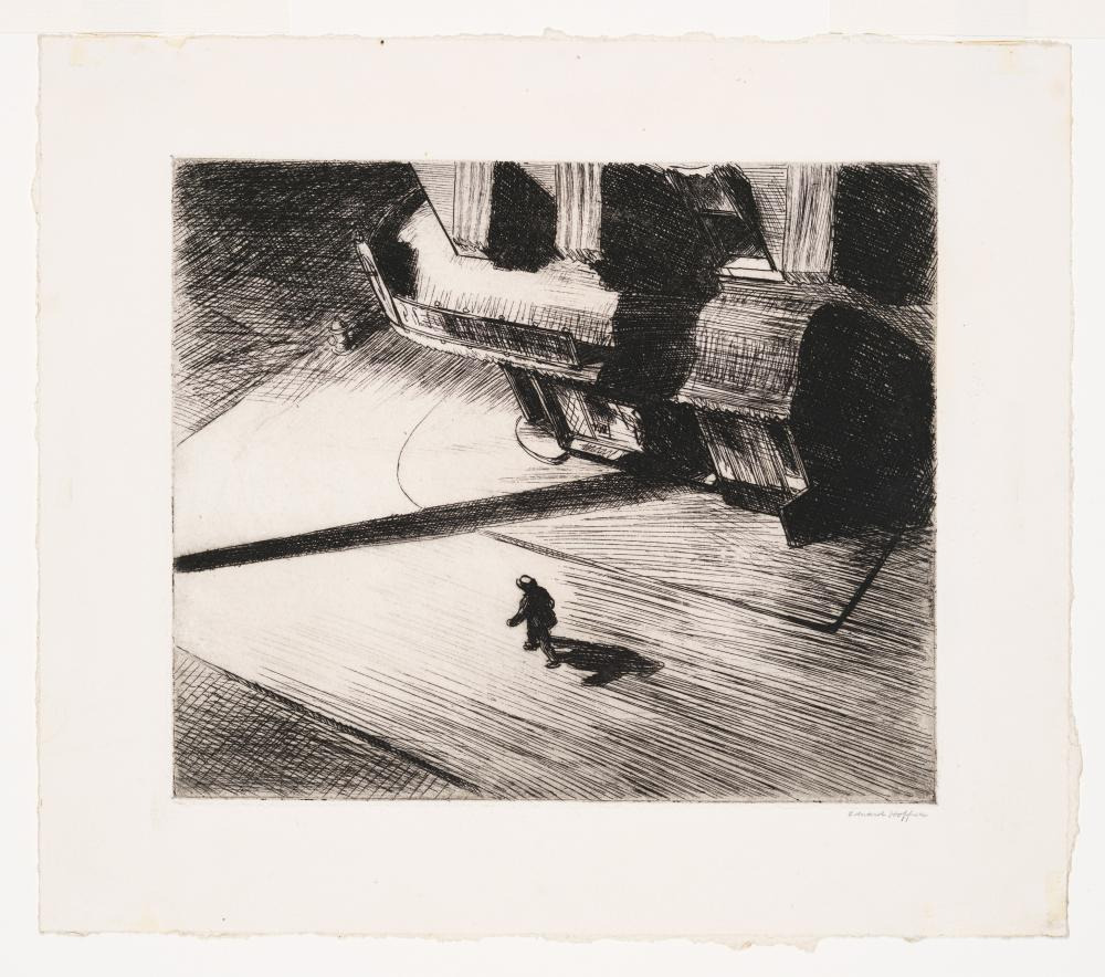 어딘가 익숙하다. 많이 본 듯한 그림. 호퍼가 건물 위에서 내려다보며 그렸을까? 우측 건물은 상당히 큰 건물처럼 보이고. 혼자 걸어가는 사람. 길게 늘어져 있는 직선 형태 그림자는 가로등이 다른 불빛에 비친 것일까? 늦은 밤이라서 건물에 불빛이 없다. 밤을 그린 그림이라 다 검은색일까? 그림 제목이 '밤의 그림자'이다. 낮의 그림자가 아니라. 밤에 비친 그림자. 그림이 나타내는 의미는? 저렇게 혼자 걸으면 외로울 것 같다. 혼자 걷는 사내인 듯 행인의 마음은 빨리 집에 가고 싶었을 것 같다.