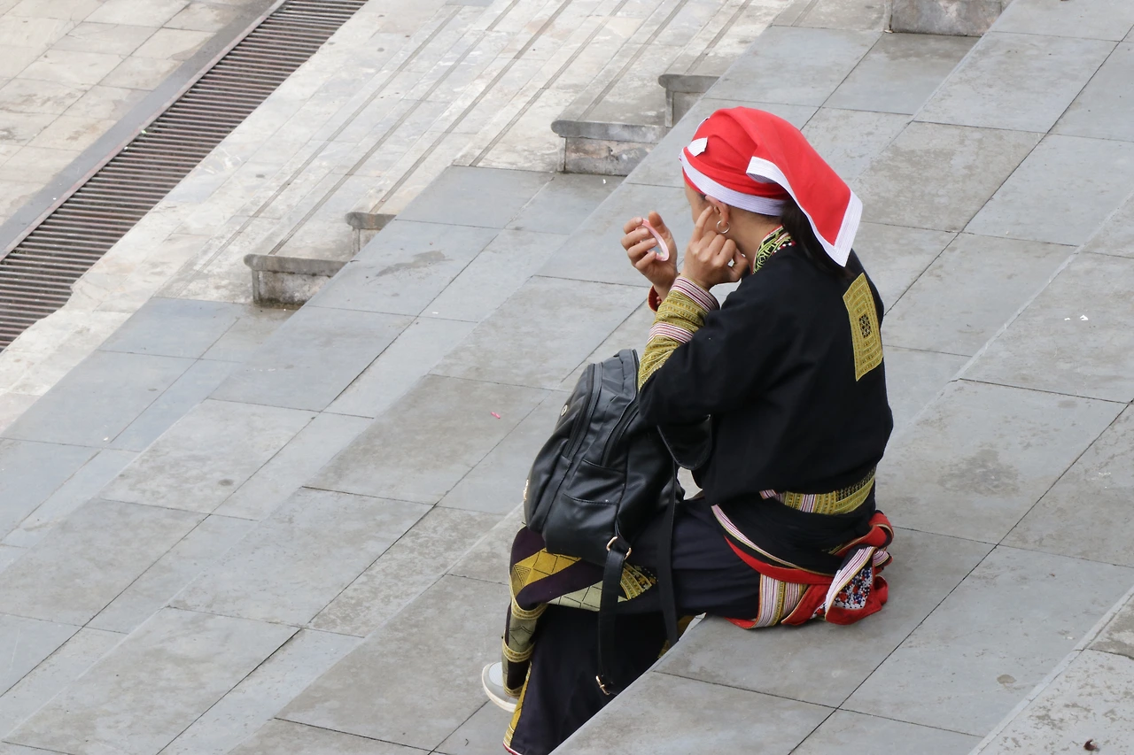 사파 광장에서 자주 눈에 띄는 소수 민족/ 거울을 보며 꽃 단장을 하는 여성. 오늘도 매번 잠시 멈춘 곳에 선다. 선 플라자 맞은편. 중국인 같은 한 무리의 사람들, 자유로운 복장으로 기웃거리는 서양인들에, 밤에도 배달 한 건 잡으려는 많은 오토바이와 운전자들. 오늘은 아이에게 소수 민족 복장을 입히는 젊은 아낙들이 눈에 많이 띈다. 첫날과 달라진 것이다. 이때까지는 몰랐다. 그네들이 뭘 하려는지. 그들 엄마는 애들에게 옷을 입히고 한편에서 스마트폰을 들여다보면서 무슨 생각을 했을까?