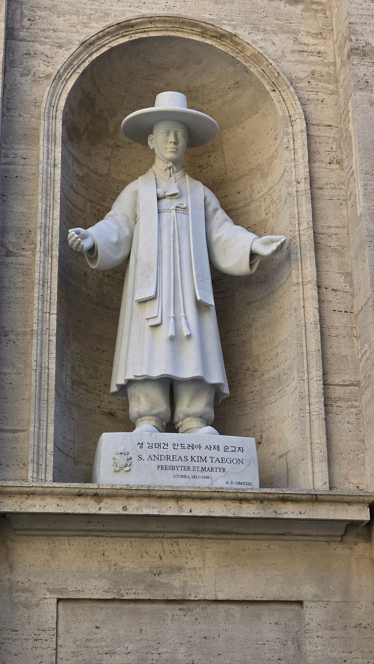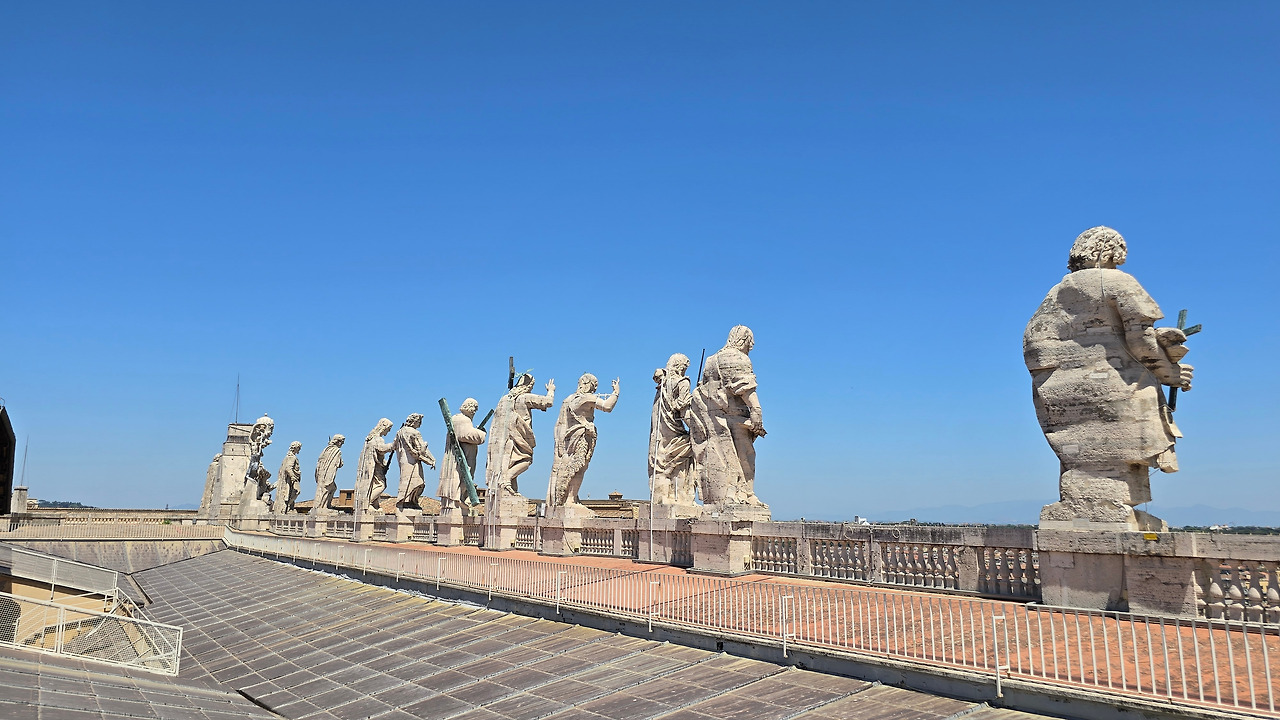 바티칸 박물관 전시물들 중 최고인 시스티나 성당 미켈란젤로의 천지창조와 최후의 심판을 찍을까 말까, 이러라고 울트라 폰을 산 것은 아니지만, 남들 몇몇이 찍는 그 유혹들을 물리치고 한 번 더 한 번 더 쳐다보다 종국엔 이리저리 밀려, 스위스 근위병이 있는 곳까지 걷게 되는데, 여기서 그들을 찍다가는 다시 한번 잔소리를 듣고 떠밀리다 보면, 바로 베드로 성당에 다다르게 된다. 오랜 기다림 속에 성당에 입장해야 하는 사람들보다 은총을 받았다고 뻐기면서 성당 내부에 도착하기 전 먼저 반기는 건 쿠폴라를 10유로 주면 200여 개단을 덜 걷고 엘리베이터를 탈 수 있는 유혹이다. 그냥 8유로 주고 예수가 겪은 고난을 상기하는 것보다 쉬운 길을 선택하며, 쿠폴라 비용을 계산하는 나를 내려다보는 김대건 신부님이 웬일인지 흐뭇하게 웃는 것 같아 썩소를 날리며 기꺼이 올라간 쿠폴라. 그곳에서 내려다본 산 피에트로 광장은?