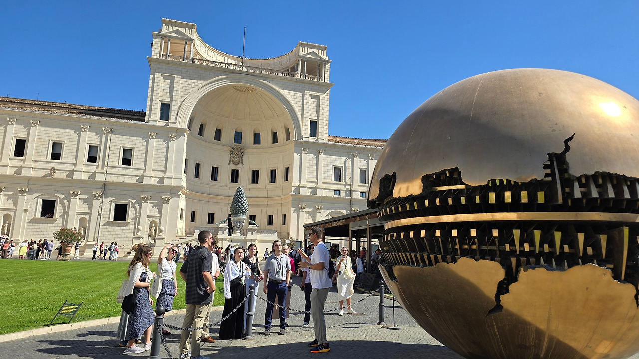 솔방울 정원 - 피냐 정원으로도 불림. 왼편 작품은 아르날도 포모도르가 만든 천체 속의 천체. 현대작품이다.