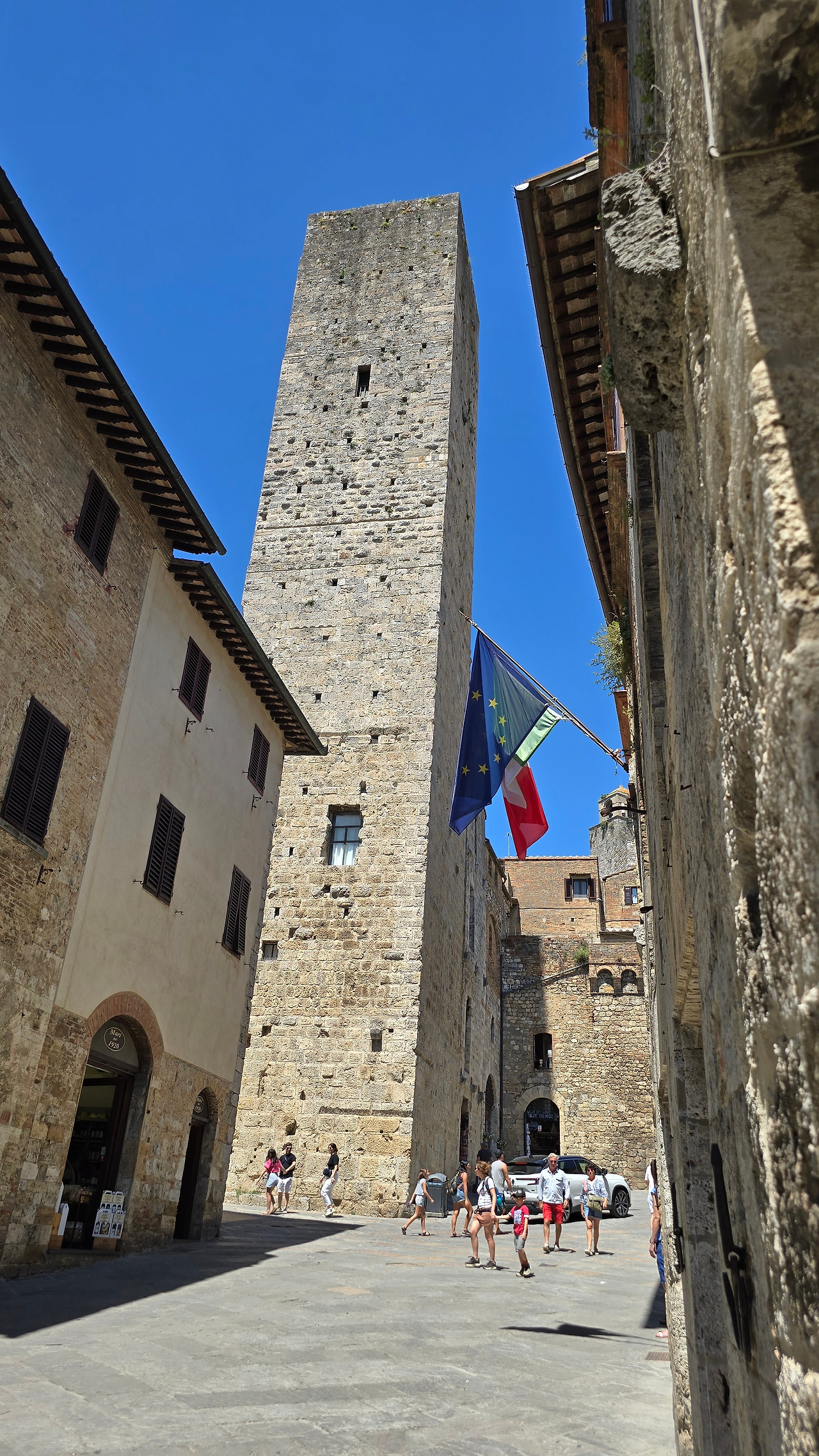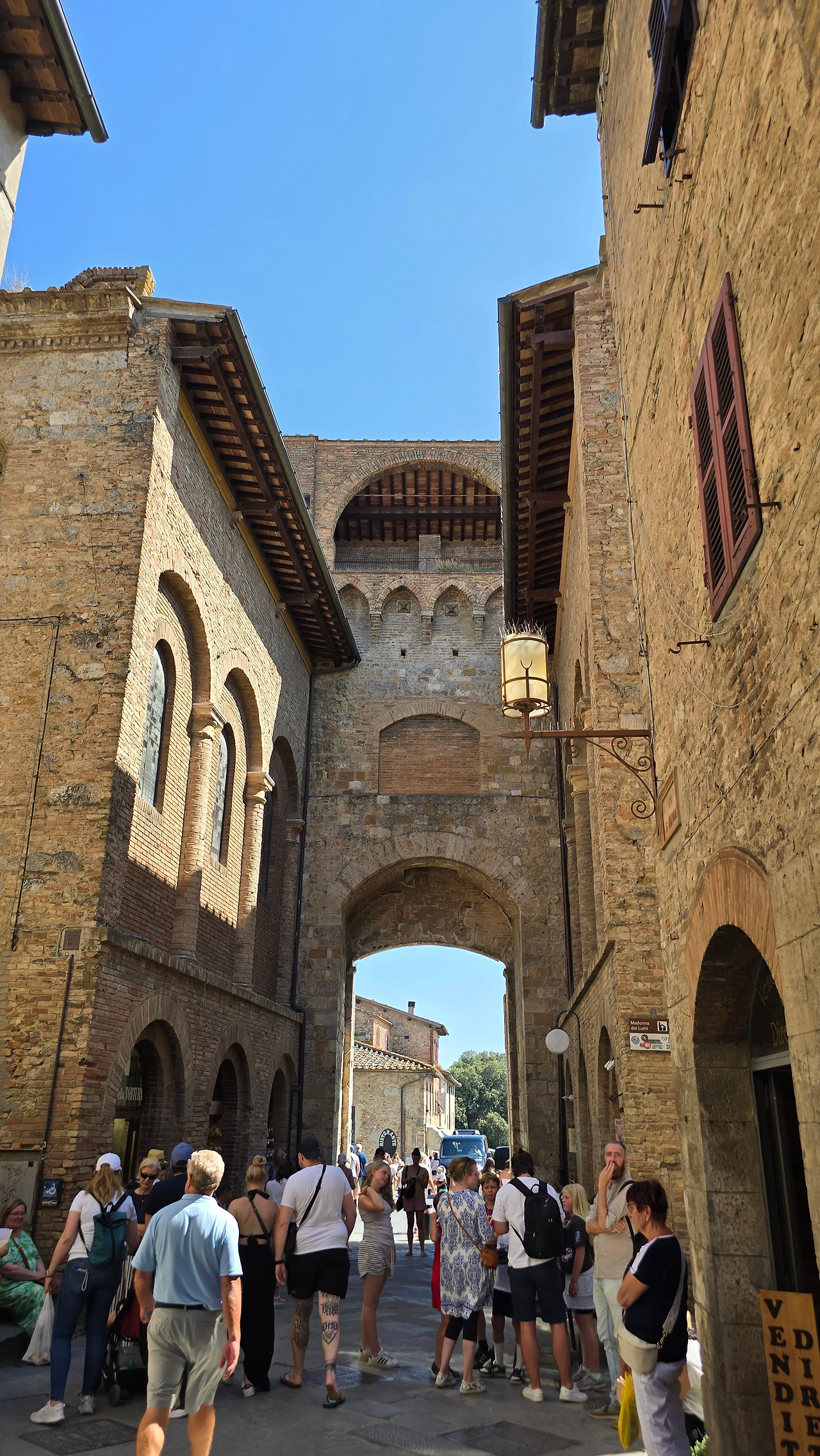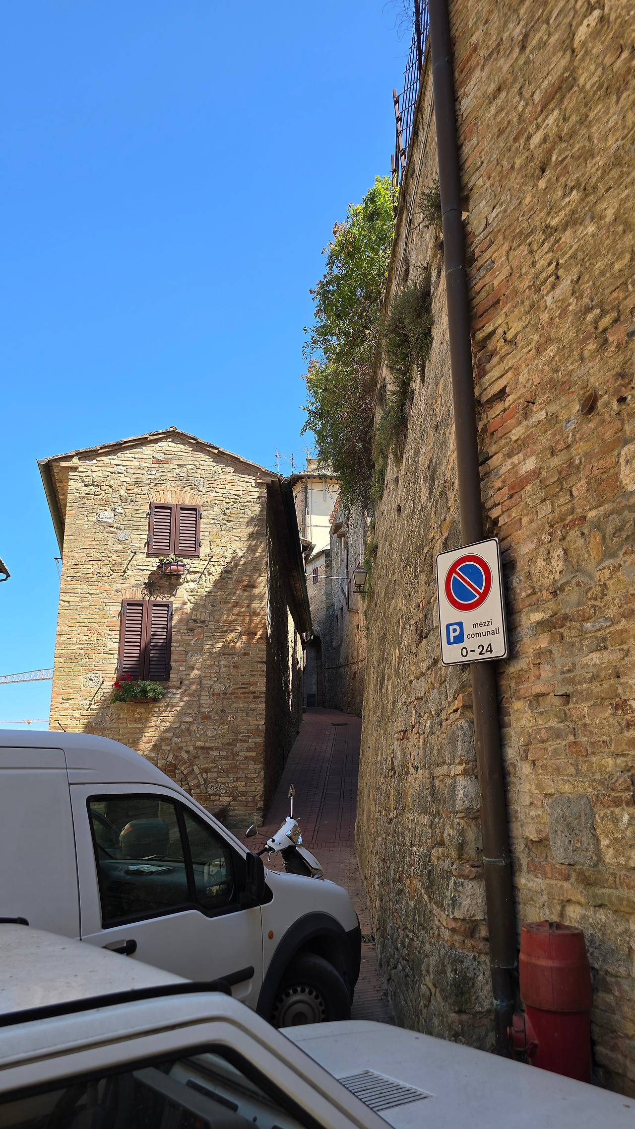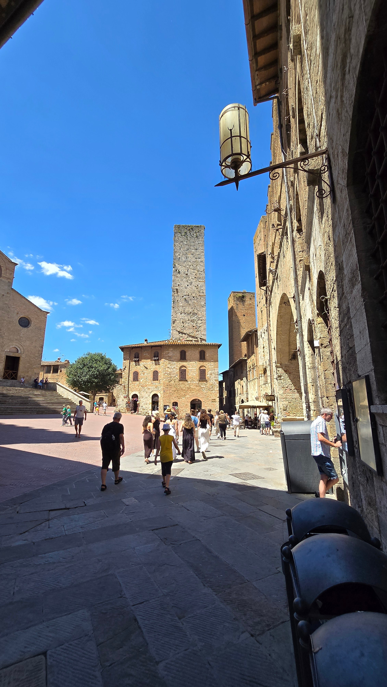 산지미냐노는 발음이 어렵다. 산이 들어갔으니 성인의 도시이다. 성 제미니아노가 훈족의 아틸라로부터 이 도시를 구한 후 서기 450년에 산지미냐노로 바꿨는데, 훌륭한 탑들의 도시라고 불리는 이유는 12개의 성곽들이 잘 보존되어 중세건축으로 유명해졌다고 한다. 그로 인해 유네스코 세계유산으로 정해진 곳. 귀족들간의 경쟁으로 좀 더 높은 성곽을 짓게 된 것 시작이라고 하나, 보다 더 중요한 것은 이곳 거리 골목을 거닐면 진짜 중세로 시간 이동을 한 것 같다는 것이다. 하나 더 이 도시는 비아 프란체지나 라는 성지순례길을 걸으면 거쳐야 하는 순례의 도시이기도 하다.