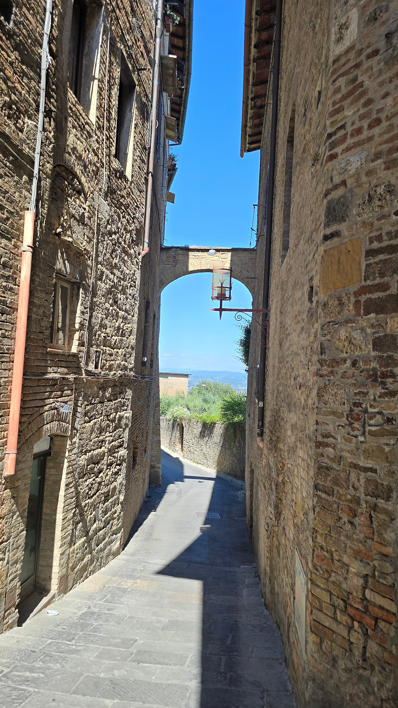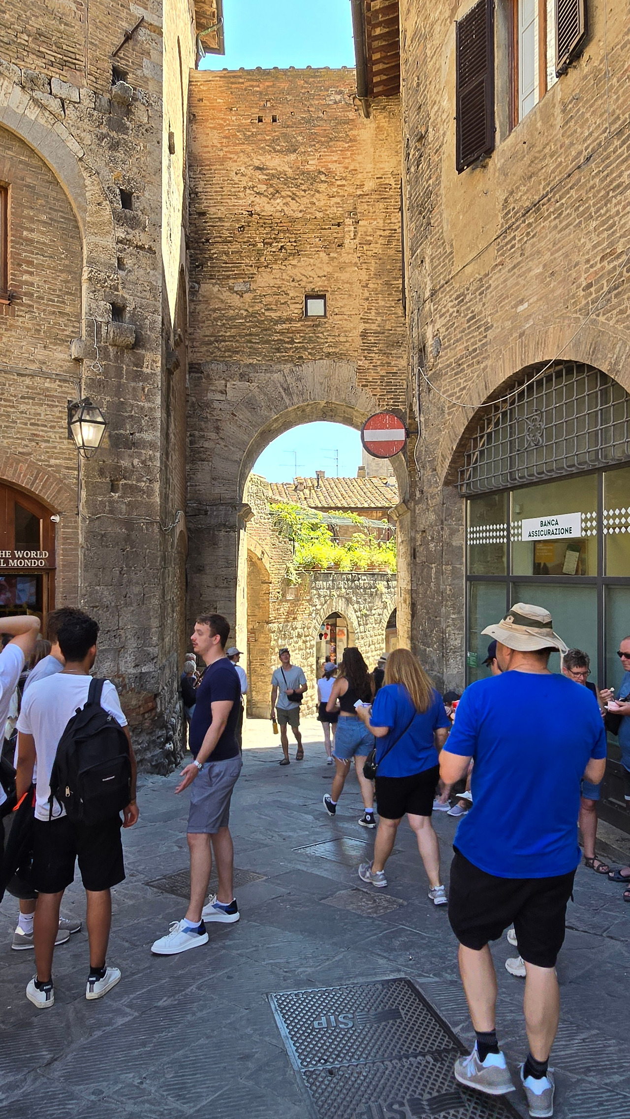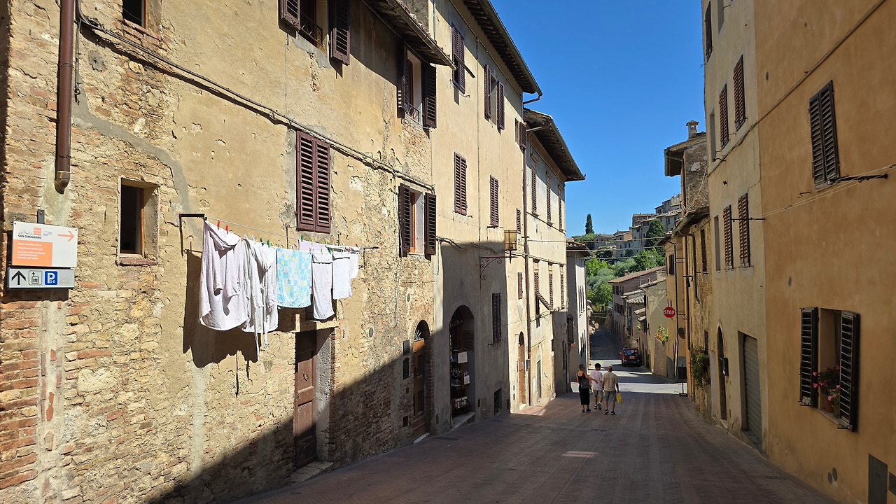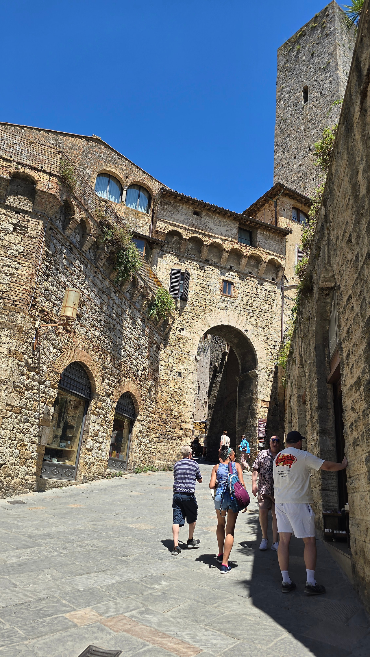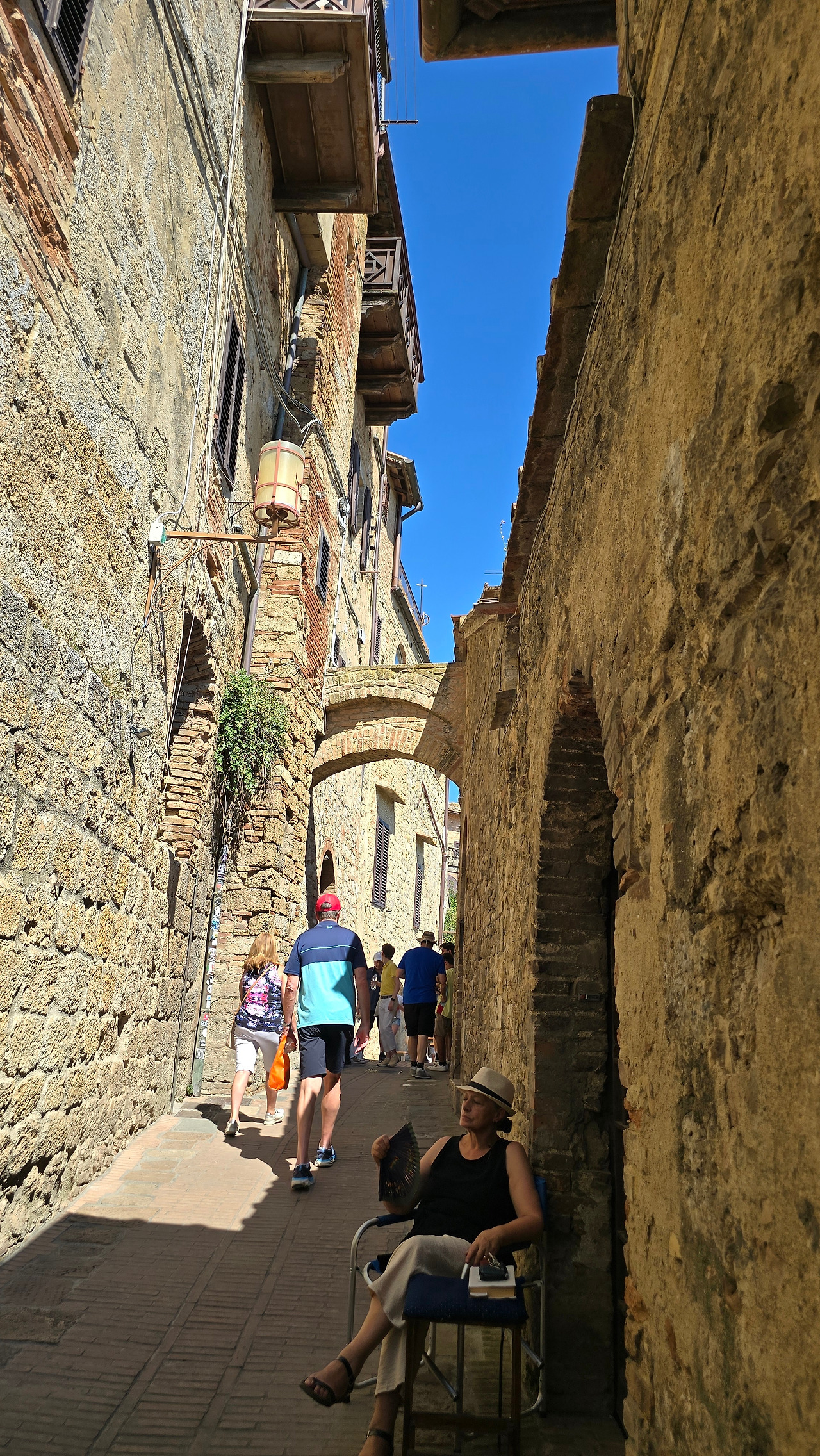 산지미냐노는 발음이 어렵다. 산이 들어갔으니 성인의 도시이다. 성 제미니아노가 훈족의 아틸라로부터 이 도시를 구한 후 서기 450년에 산지미냐노로 바꿨는데, 훌륭한 탑들의 도시라고 불리는 이유는 12개의 성곽들이 잘 보존되어 중세건축으로 유명해졌다고 한다. 그로 인해 유네스코 세계유산으로 정해진 곳. 귀족들간의 경쟁으로 좀 더 높은 성곽을 짓게 된 것 시작이라고 하나, 보다 더 중요한 것은 이곳 거리 골목을 거닐면 진짜 중세로 시간 이동을 한 것 같다는 것이다. 하나 더 이 도시는 비아 프란체지나 라는 성지순례길을 걸으면 거쳐야 하는 순례의 도시이기도 하다.