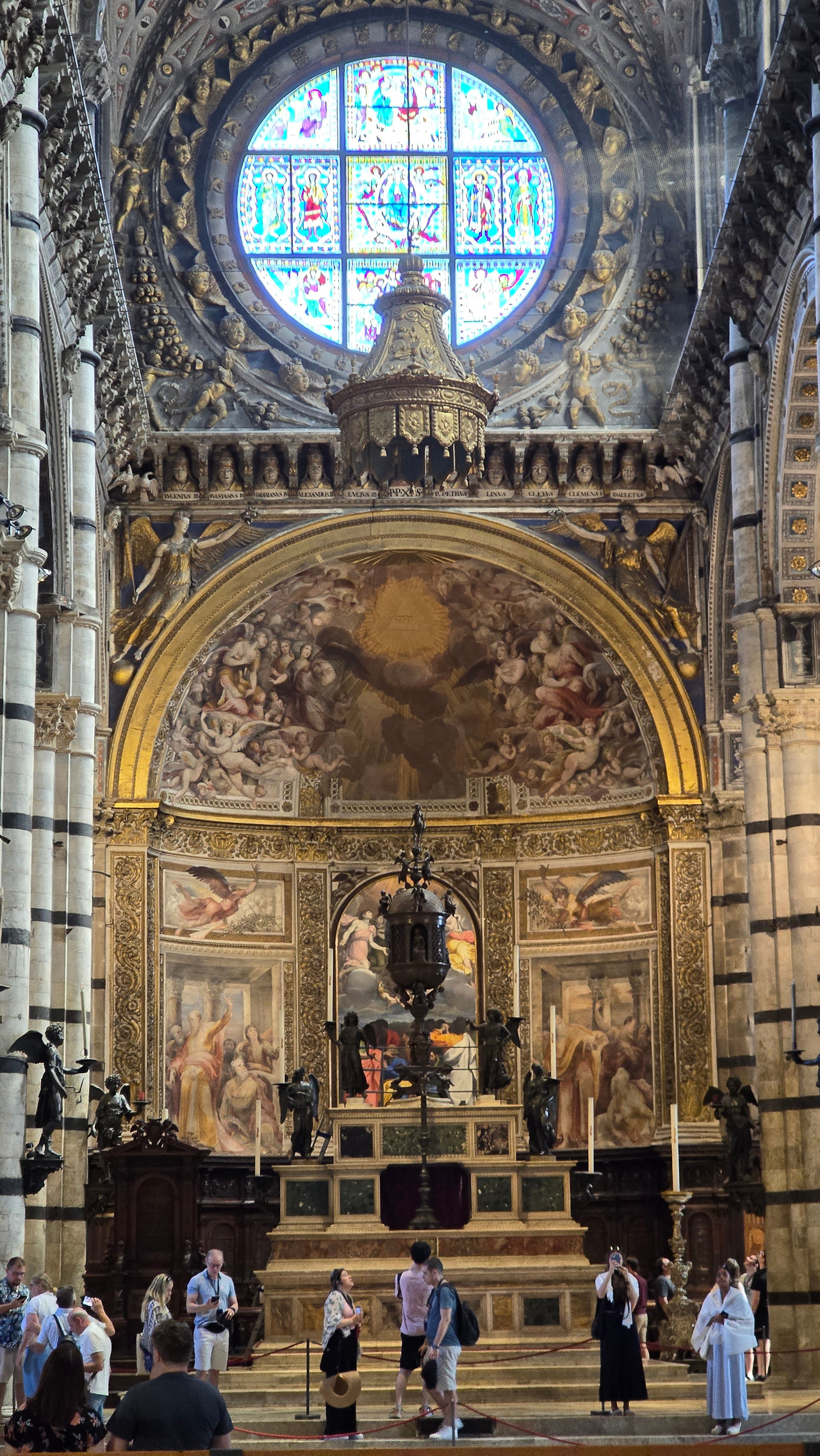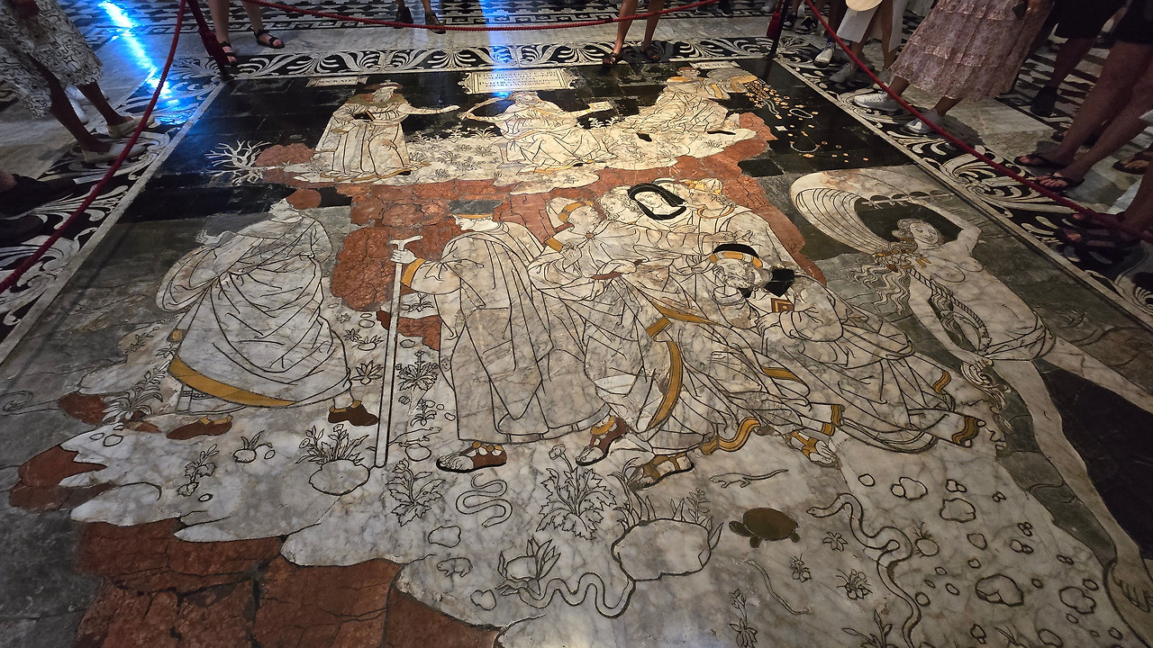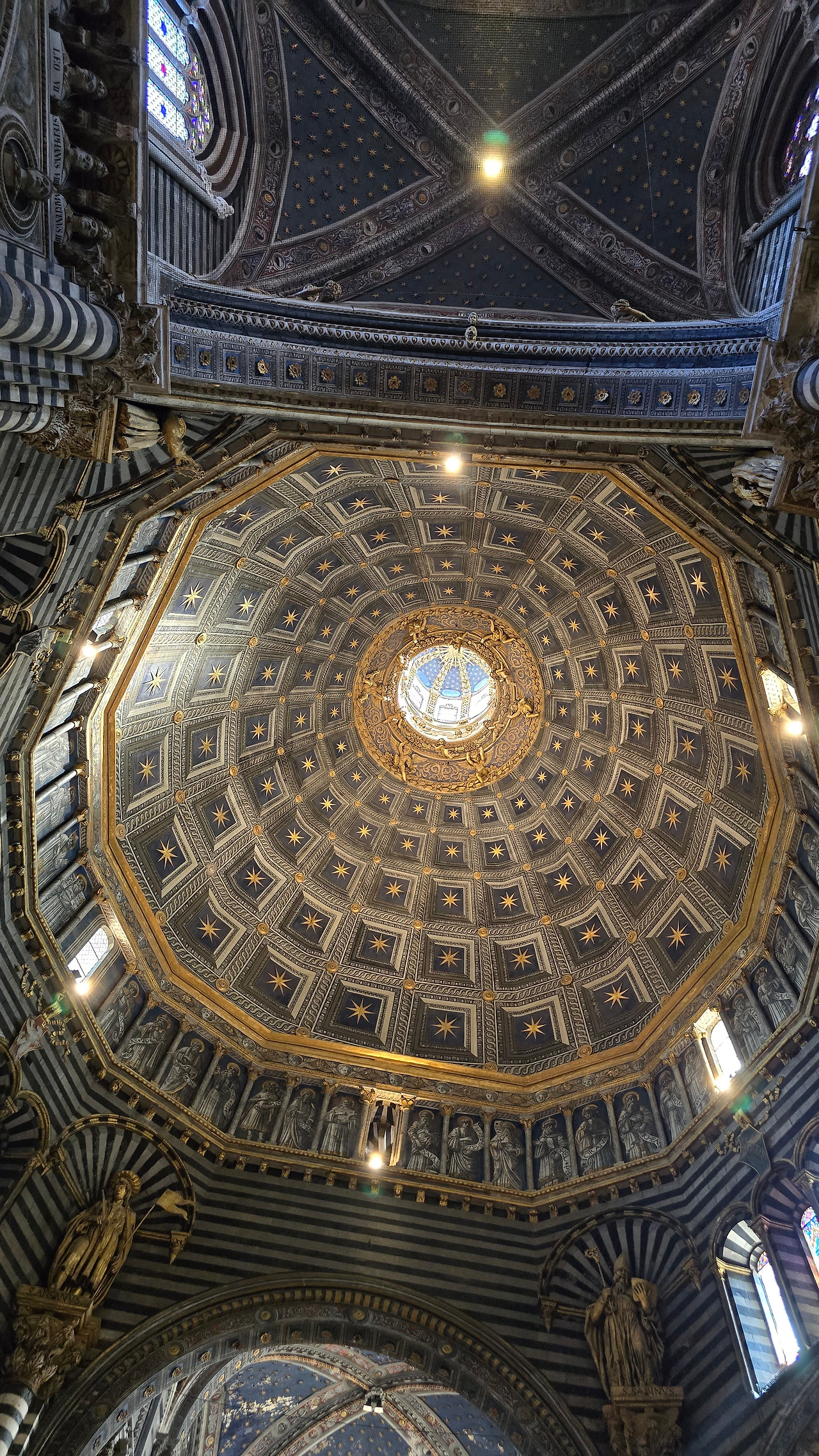 반복하지만 시에나 두오모를 역시나 하게 하는 가장 큰 이유는 흑백의 줄무늬인데, 이건 신들에게 제사를 드릴 때 흰 연기와 검은 연기를 피워 올린데 기원한다고 한다. 이것이 어쩜 누군가에게 가장 인상적인 성당으로 자리 잡게 하는 요인이며, 베르니니가 만든 황금을 상징한 돔 천장과 다른 어느 곳에서 볼 수 없는 상감기법의 대리석 바닥과 미켈란젤로, 니콜라 피사노의 작품 등이 절묘하게 어울려 베니스와 피렌체, 로마의 어느 성당에도 뒤지지 않을 걸작인 건만은 확실하지만. 역시나 이 또한 인간이 만들었다는. 비록, 피렌체에 밀리긴 했어도 시에나의 위세가 얼마나 대단했는지 알 수 있는 성당이다.