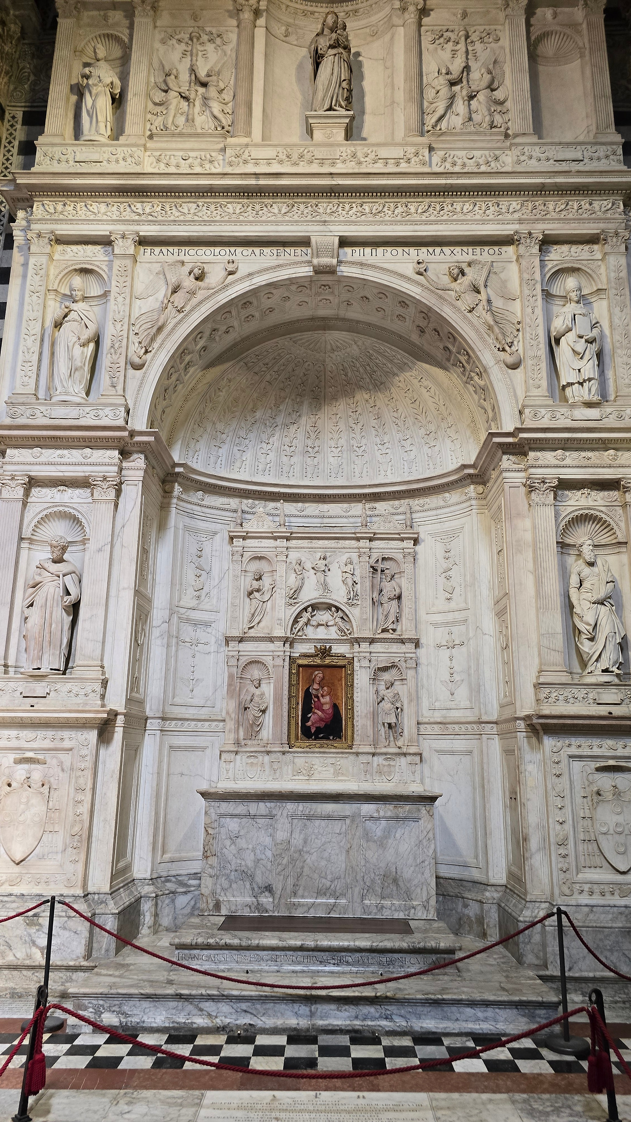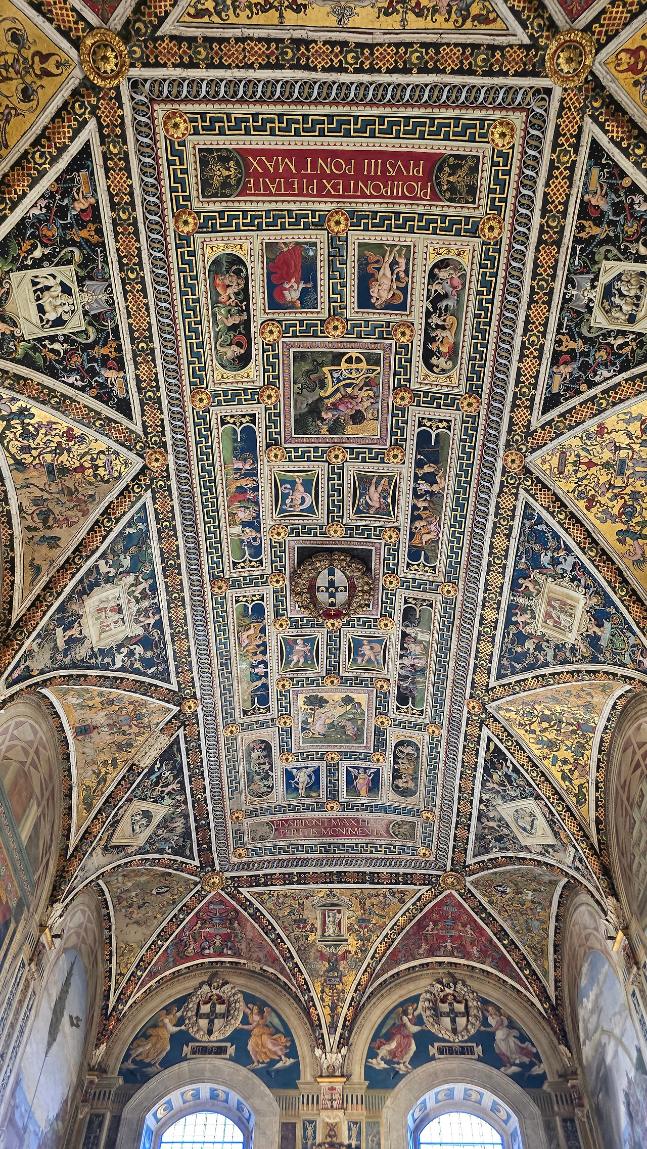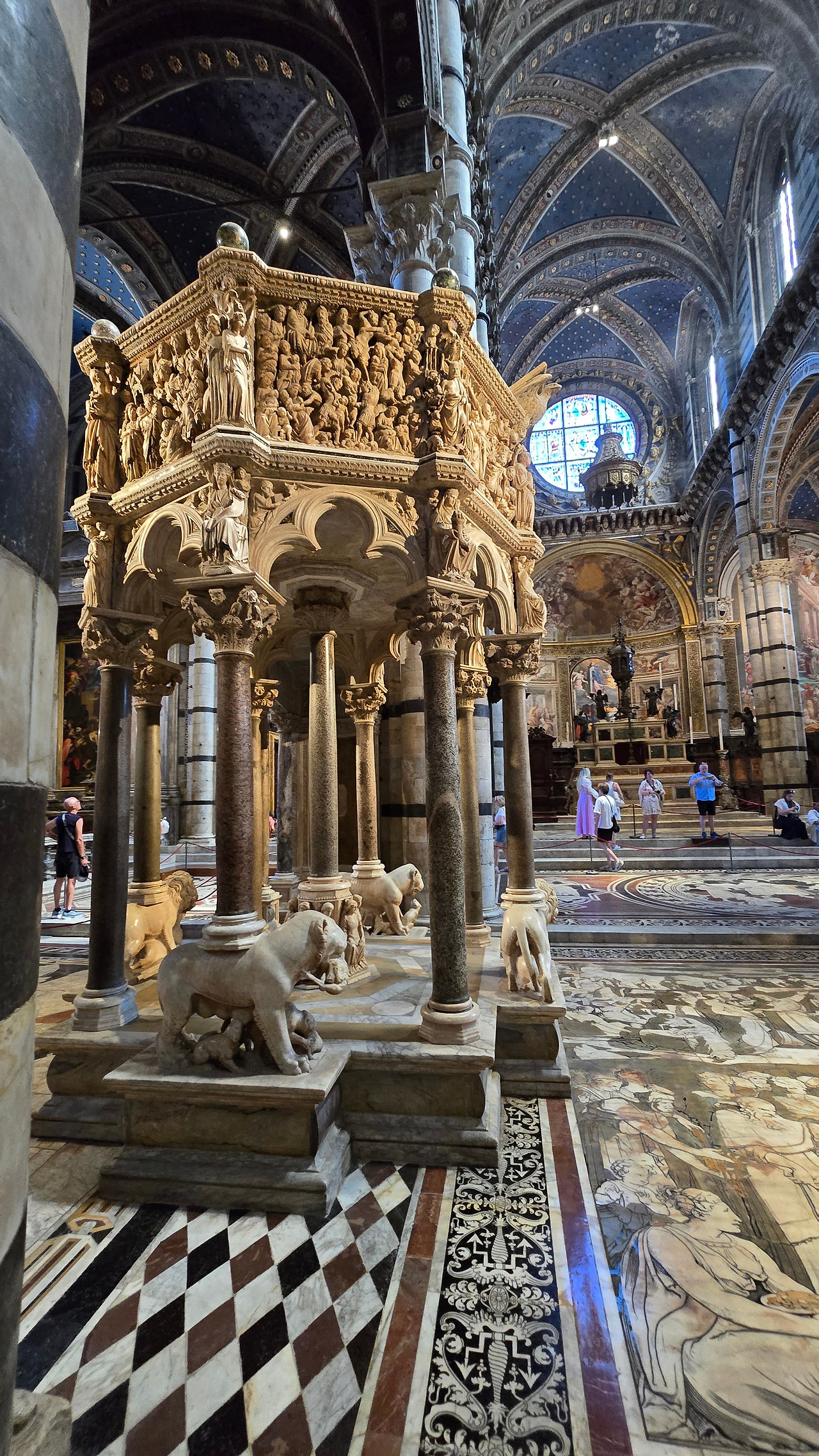 반복하지만 시에나 두오모를 역시나 하게 하는 가장 큰 이유는 흑백의 줄무늬인데, 이건 신들에게 제사를 드릴 때 흰 연기와 검은 연기를 피워 올린데 기원한다고 한다. 이것이 어쩜 누군가에게 가장 인상적인 성당으로 자리 잡게 하는 요인이며, 베르니니가 만든 황금을 상징한 돔 천장과 다른 어느 곳에서 볼 수 없는 상감기법의 대리석 바닥과 미켈란젤로, 니콜라 피사노의 작품 등이 절묘하게 어울려 베니스와 피렌체, 로마의 어느 성당에도 뒤지지 않을 걸작인 건만은 확실하지만. 역시나 이 또한 인간이 만들었다는. 비록, 피렌체에 밀리긴 했어도 시에나의 위세가 얼마나 대단했는지 알 수 있는 성당이다.