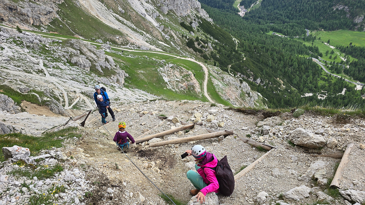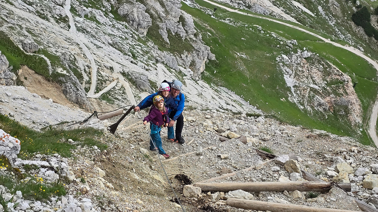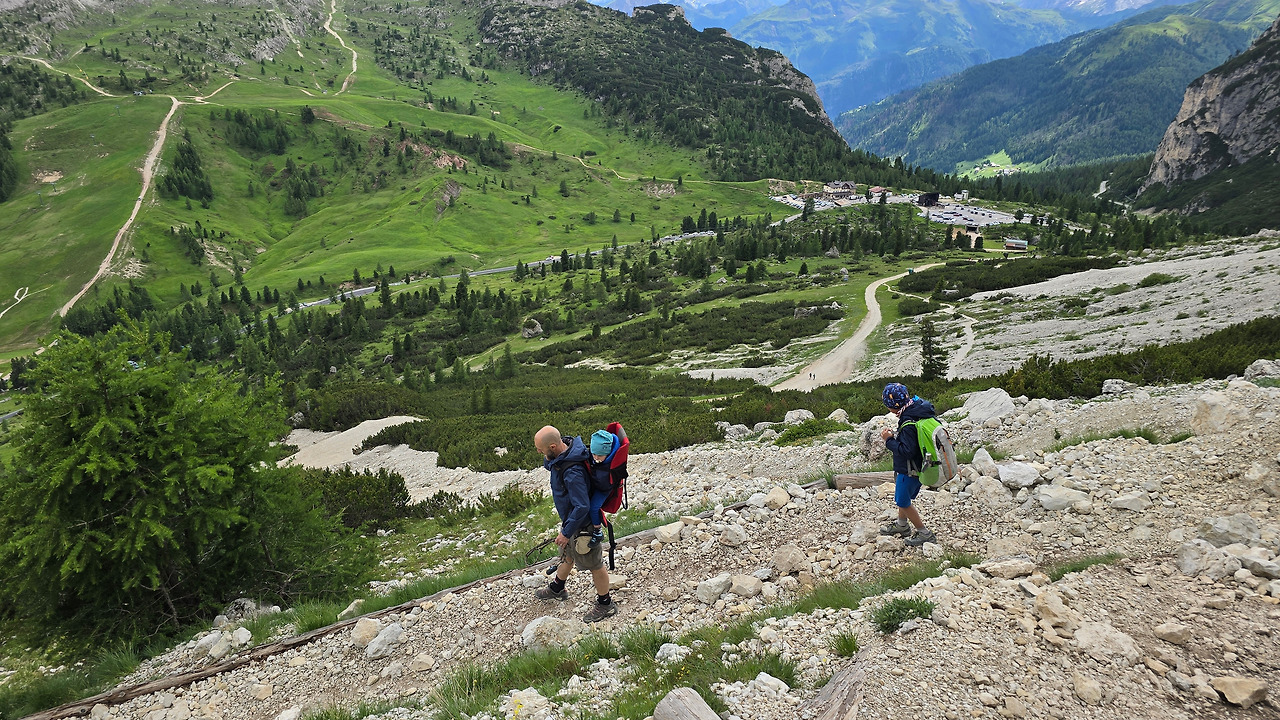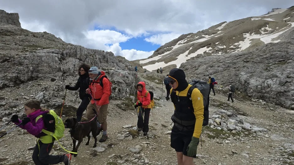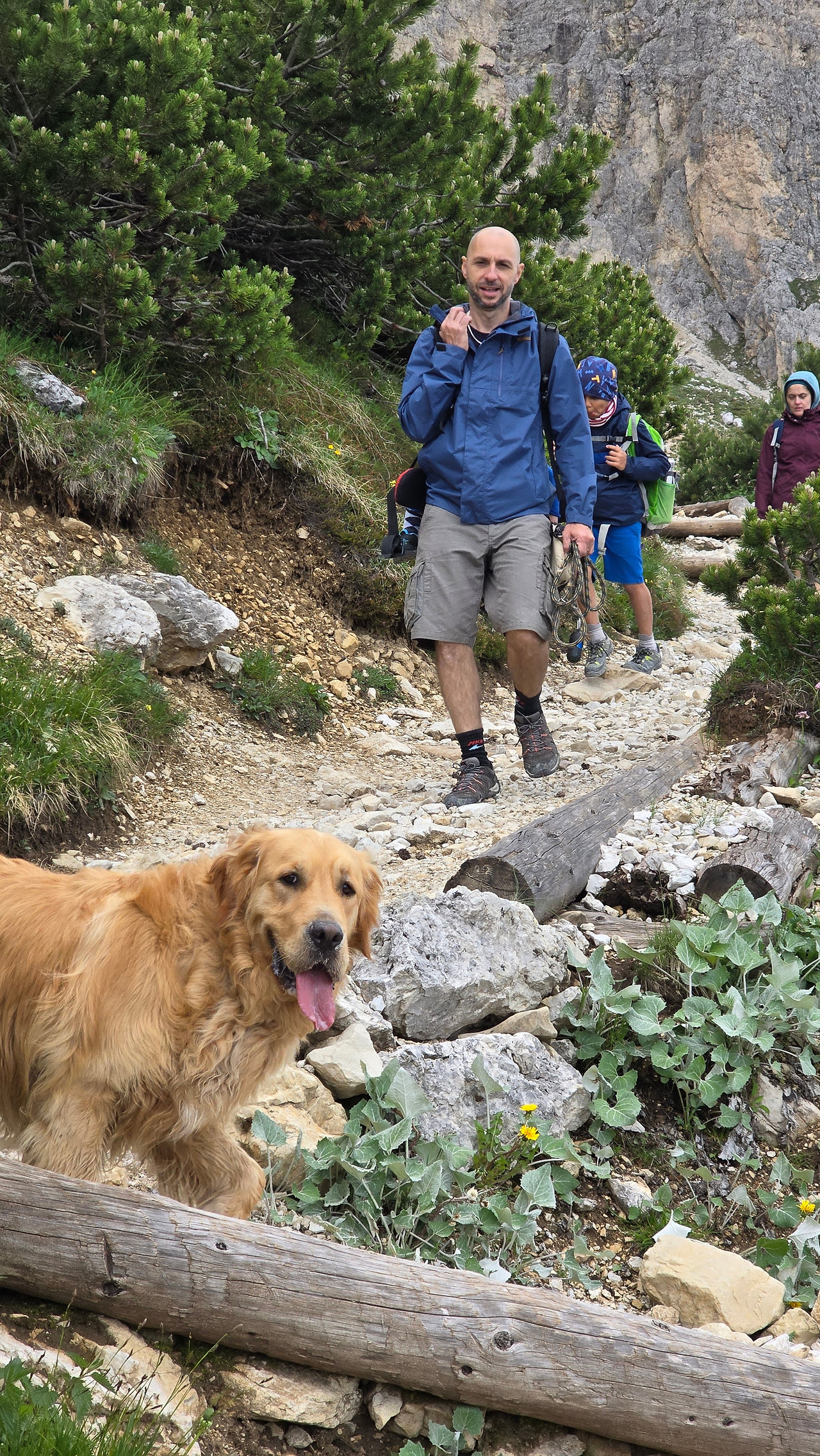 돌로미티는 길이 사방팔방으로 트여있어 산에 접근하기 좋다. 그러니 가족 단위 여행객들을 많이 만나게 된다. 그때 가족엔 대부분 개 한 마리 포함된다. 고양이를 좋아해도 고양이를 산에 같이 갈 수 없잖은가. 그런데 개는 아니다. 젊은 부부가 아내와 아들과 딸인지 아들인지 남편이 뒤에 아기를 업고 내려가고 있다. 이곳에서 이건 일상이다!
