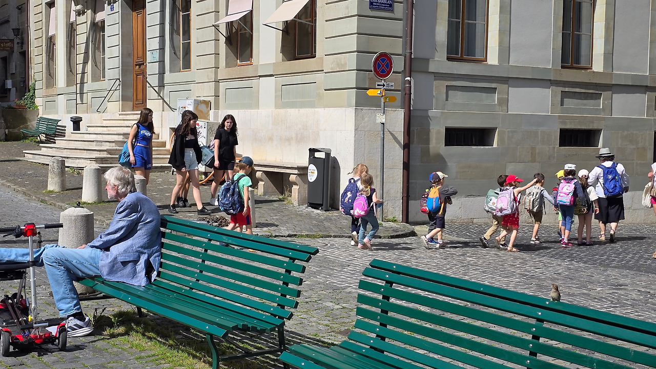 왼쪽 위 사진 : 제네바 성 피에르 성당 앞 건물에 음악 삼매경인지 독서 삼매경인지 몰두해 있는 소녀 모습이 아름답다. 저 높이가 꽤 되는데 아랑곳하지 않다니. 오른쪽 위 사진 : 오른쪽 사진은 어디서 학생들이 견학을 온 것 같다. 얼마나 선생님 말씀을 잘 따르던지 기특했다. 오른쪽 아래 사진은 찍으면서도 담긴 풍경이 흥미로왔다. 세상을 다 산 듯이 해맞이하는 할아버지 뒤로 젊은 여성 3명이 지나가고, 그 앞에 유치원생인듯한 어린아이들이 선생님을 따라 일렬로 걸어가고 있었다. 어디건 다 비슷하게 사는 것 같다. 왼쪽 아래 사진은 성당을 나와 어느 역사적인 건물 앞에서 많은 학생들이 선생님의 지시를 따르고 있었다. 역시나 견학? 하기야 그날이 평일이었으니.