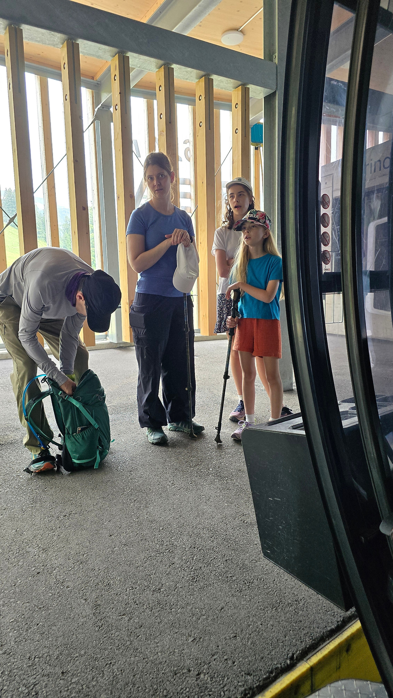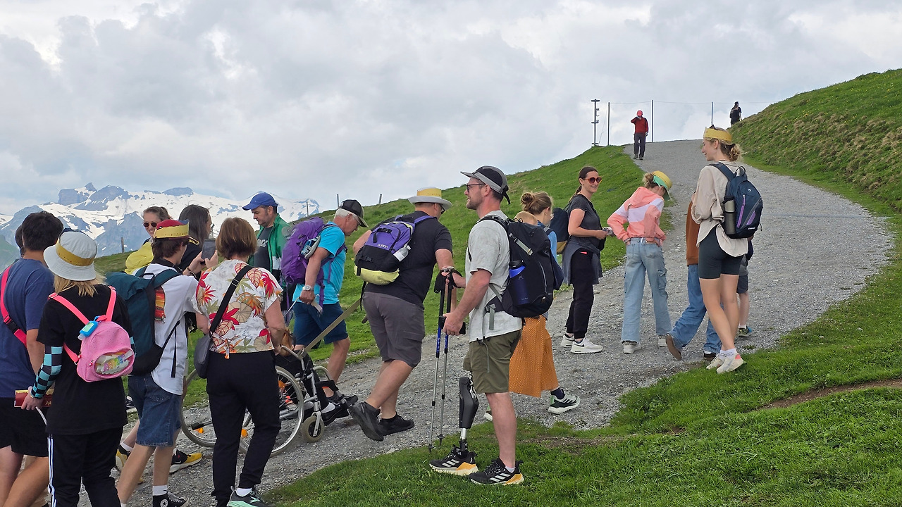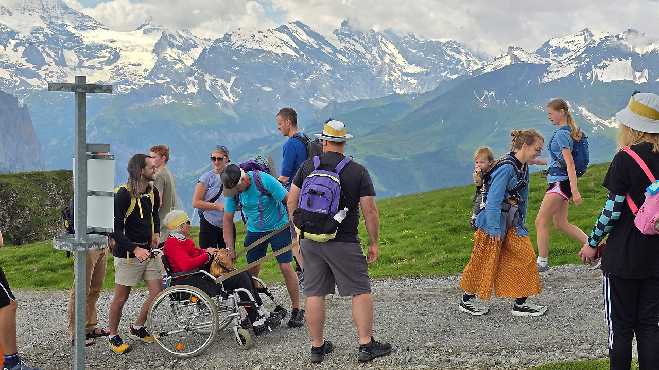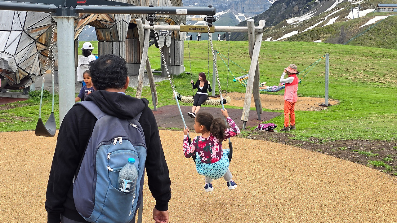 왕의 트레일은 융프라우, 뮌히, 아이거 3대 미봉을 볼 수 있는 곳이다. 그곳을 걷다가 본 장면들. 가족들인지 아닌지 멋진 경치를 혼자가 아닌 같이 보기 위해 휠체어를 끌고 밀어주는 사람들. 왼쪽 위 사진은 그중에 한 명이 눈에 들어왔다. 의족을 하고 경치를 조망하는. 아래 왼편 사진은 왕의 트레일까지 곤돌라 등 교통편이 좋아 가족 단위 여행객들이 많은데, 곤돌라 타는 뒤편에 놀이터에서 즐겁게 아이들과 어른들도 놀고 있었다. 다음 차례를 기다리는 가족. 이들은 자기들끼리 타기 위해 몇 대를 그냥 보냈을까? 잠시 정상에서 내려가다 중간에 잠깐 내렸었나 보다. 자기들끼리 타려 빈 곤돌라가 오기를 기다리는 모습. 이들은 어디서 온 것일까?