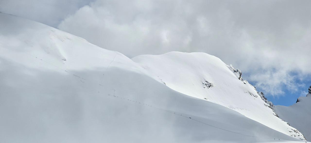 마테호른을 정면으로 볼 수 있는 전망대를 리프트와 곤돌라를 타고 아주 편안하게 오르면 별 세상이 펼쳐진다. 주변 높이가 3900여 미터가 되니 만만한 높이가 아닌데, 누군가는 장비를 점검한 후 서로를 묶고 다시 설산을 오른다. 사진 오른쪽 위편 사진에 박힌 점들이 다 사람들이다. 와우. 이런 풍광이 펼쳐질 줄이야!