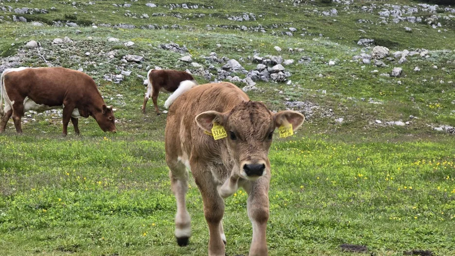 요놈을 생각하면 피식 웃음이 나온다. 엄마가 뒤에 있는 줄 알고 나에게 겁을 주려고 잠시 달려왔던 송아지이다. 정말 하룻 송아지 사람 무서운 줄 모른다더니. 세네스 산장 주변은 옛날에 비행장으로 사용된 곳이라서 평지가 펼쳐져 있다. 그 대지 위에 야생화가 지천으로 널려있다. 아무래도 이곳의 주인공은 인간이 아니다. 비록, 인간을 위해 사육되는 소들이라고 하더라도 이들이 주인공 같다. 그러니 저 송아지처럼 자기들 땅 넘보지 말라고 할 수 있는 것이다. 저놈은 뒤에 엄마 소가 없자 바로 뒤로 도망쳤다. 송아지가 화를 내면 저런 표정이다. 기억하시길!