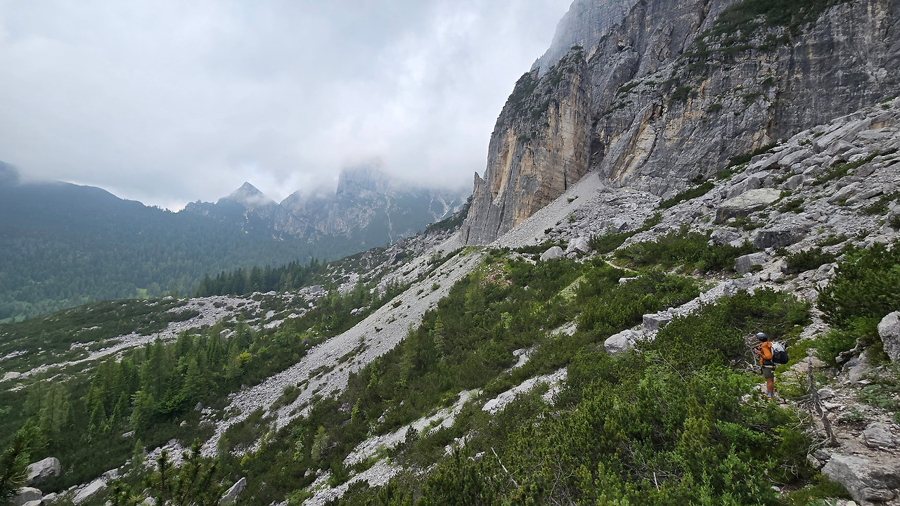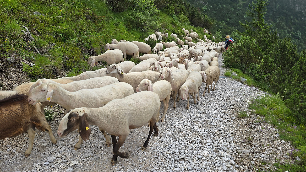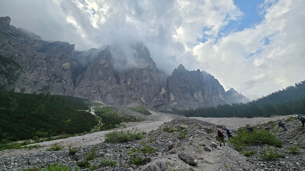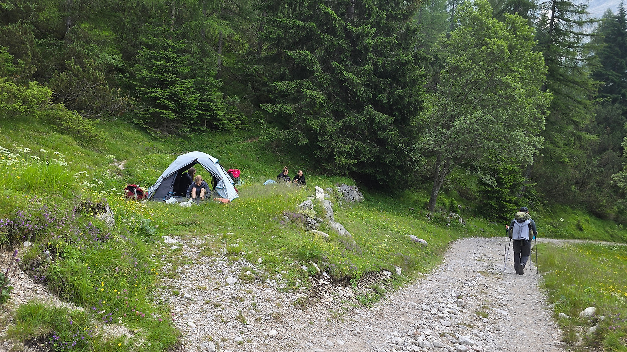 산장을 나와 걸을 때만 해도 임도(비포장도로?)를 따라 걸어 내려가는 줄 알았다. 이렇게 걸어서 5시간 정도 걸린다고? 이상한데? 이렇게 편한 길에다 내려가는데 그렇게 많이 시간이 걸린다고? 그냥 대수롭지 않게 평탄한 길을 내려갔다. 얼마 가지 않아 야영객들을 만났다. 텐트를 치고 어제 여기서 잤나 보다. 젊어 보이는 그들. 역시나 젊다는 것은 부러운 것이다. 좀 더 나아가니, 이번엔 양 떼 들이다. 그렇지. 여긴 알프스다. 목동도 당연히 있고. 이탈리아 돌로미티 지역이라는 것만 다를 뿐. 이색적인 풍경에 호기심 어린 눈빛으로 왼편을 보니 역시나 늠름하게 치베타 산군이 지켜주고 있다.