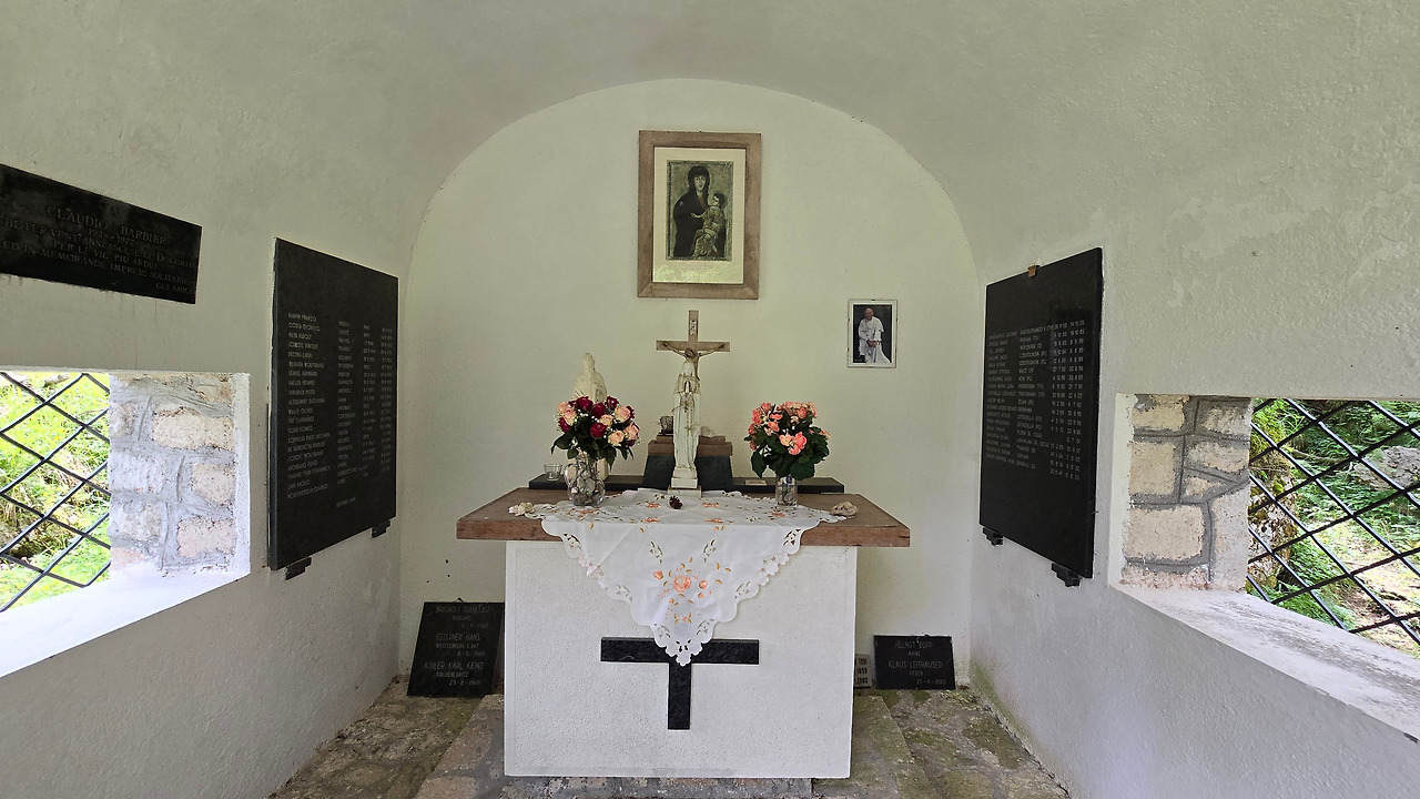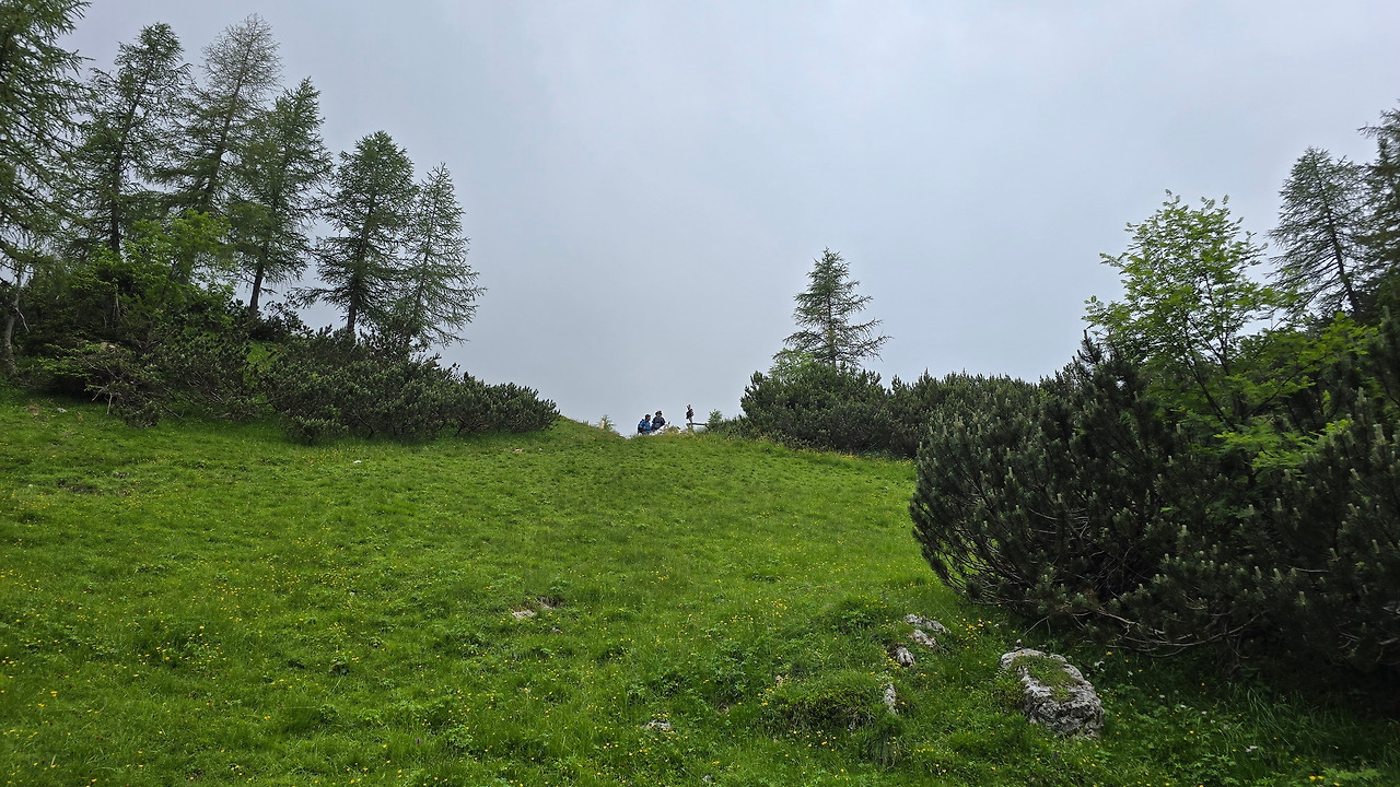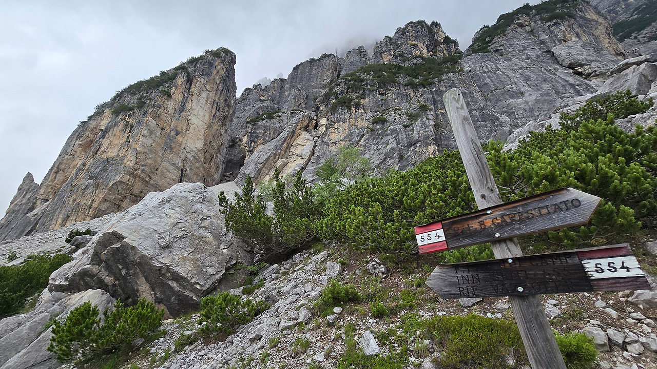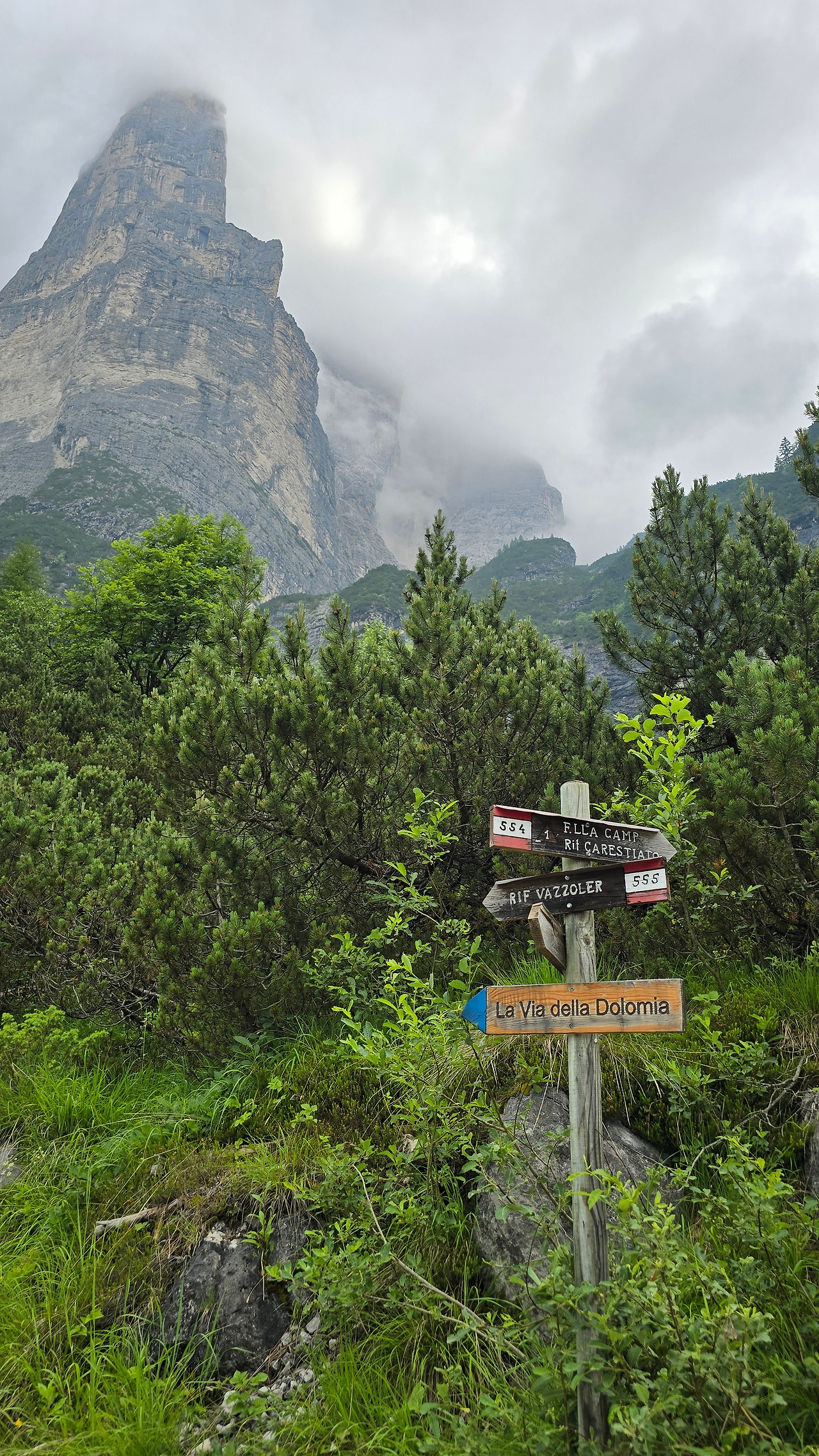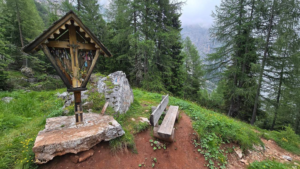 다시 시작된 산행. 누군가 여기서 얼마 안 가서 우리의 목적지인 산 세바스티아노 산장이 나온다고 했던 것 같다. 그래야지. 그렇게 믿고 걸으며 보니 이정표가 다시 나왔다. 이렇게 반가울 수가. 끝나가는 것이다. 이제 내려가기만 하면 되는. 아쉬움이 밀려오기 시작했다. 호젓하게 산길을 걷는 것도 이제 마지막인가 생각하니 잠시 마음을 흔들었다. 끝나가는 산행에 대한 감사함은 그곳에 길 잃은 산객들을 위로하듯 서있는 십자가 상에 인사를 드리고 다시 하산을 최대한 늦추면서 걸었다. 트레킹 내내 사실은 오늘뿐만 아니라 거의 항상 앞에 서거나 가급적 뒤에서 걸었다.