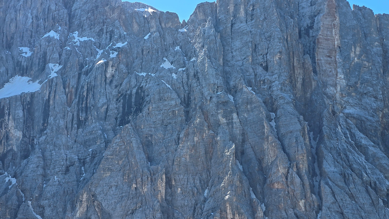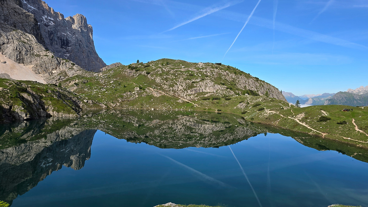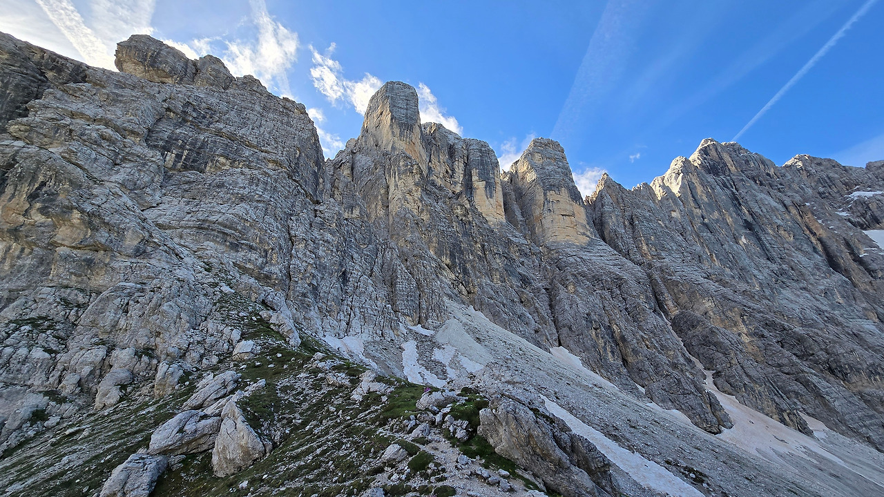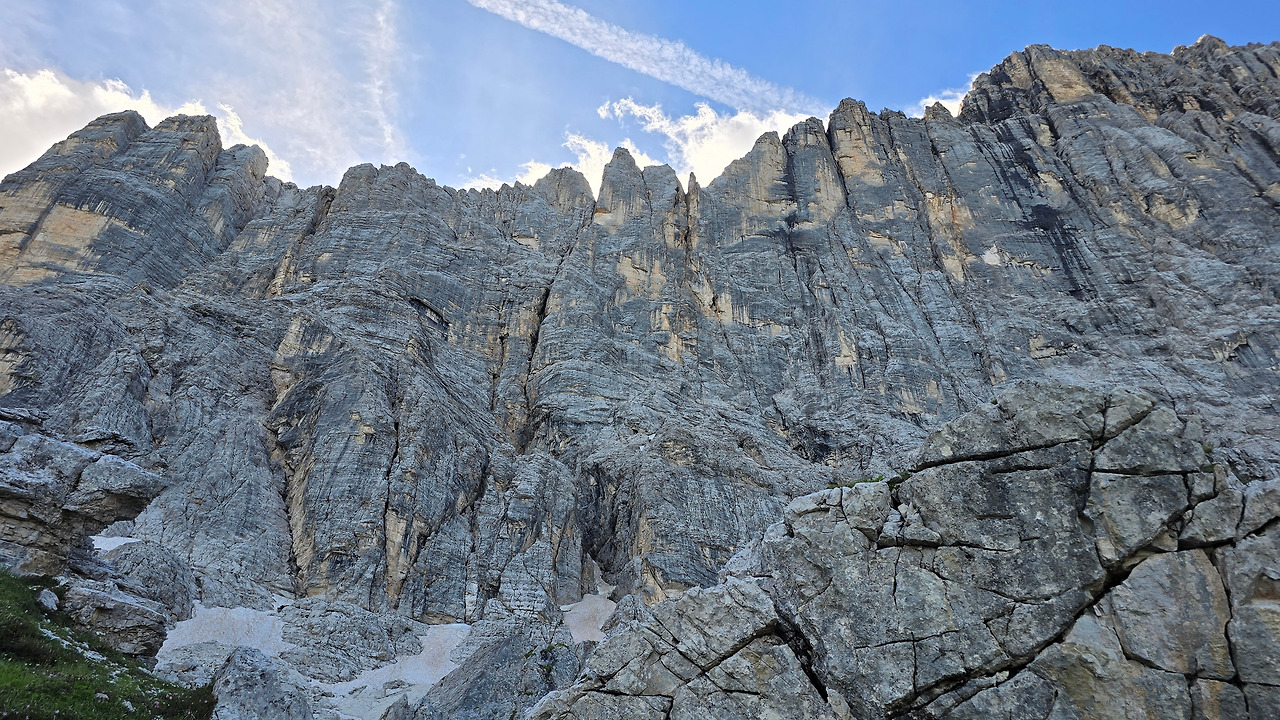역시나 제일 뒤에 쳐져 산장을 나와 오르막을 걷다 다시 내려다봤다. 내가 어제 잠을 잔 산장이 무사한지 애정을 가지고 쳐다보던 순간. 어! 하늘에 누가 낙서를 해놓았다. 어릴 때 학교 교실 칠판에 줄을 쫙쫙 직선으로 그린 낙서! 사람이 할리는 없고, 할 수도 없는 낙서. 하늘이 파래서 그런 건지 공기가 깨끗해서 그런 건지 이런 작품을 허락 없이 남겨 놓다니. 저렇게 낙서한 비행기 조종사들을 다 찾아서 혼내줄 수도 없고. 이런 민낯을 가지고 있을지 예상하지 못했다. 돌로미티는 자연만 예쁜 게 아니라 하늘까지 예쁘다니.