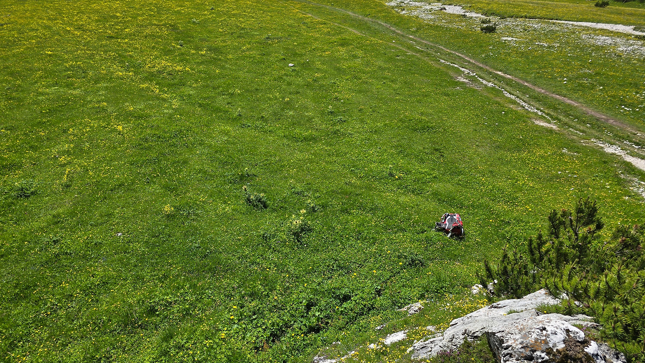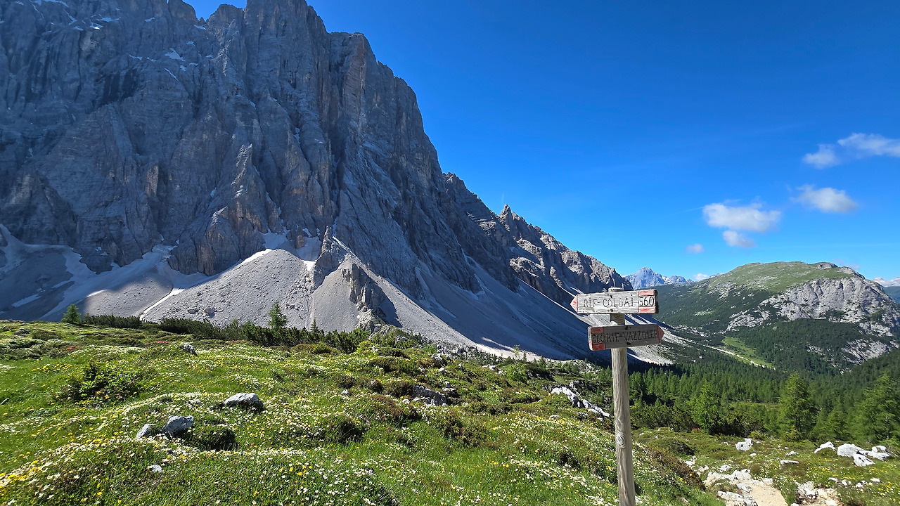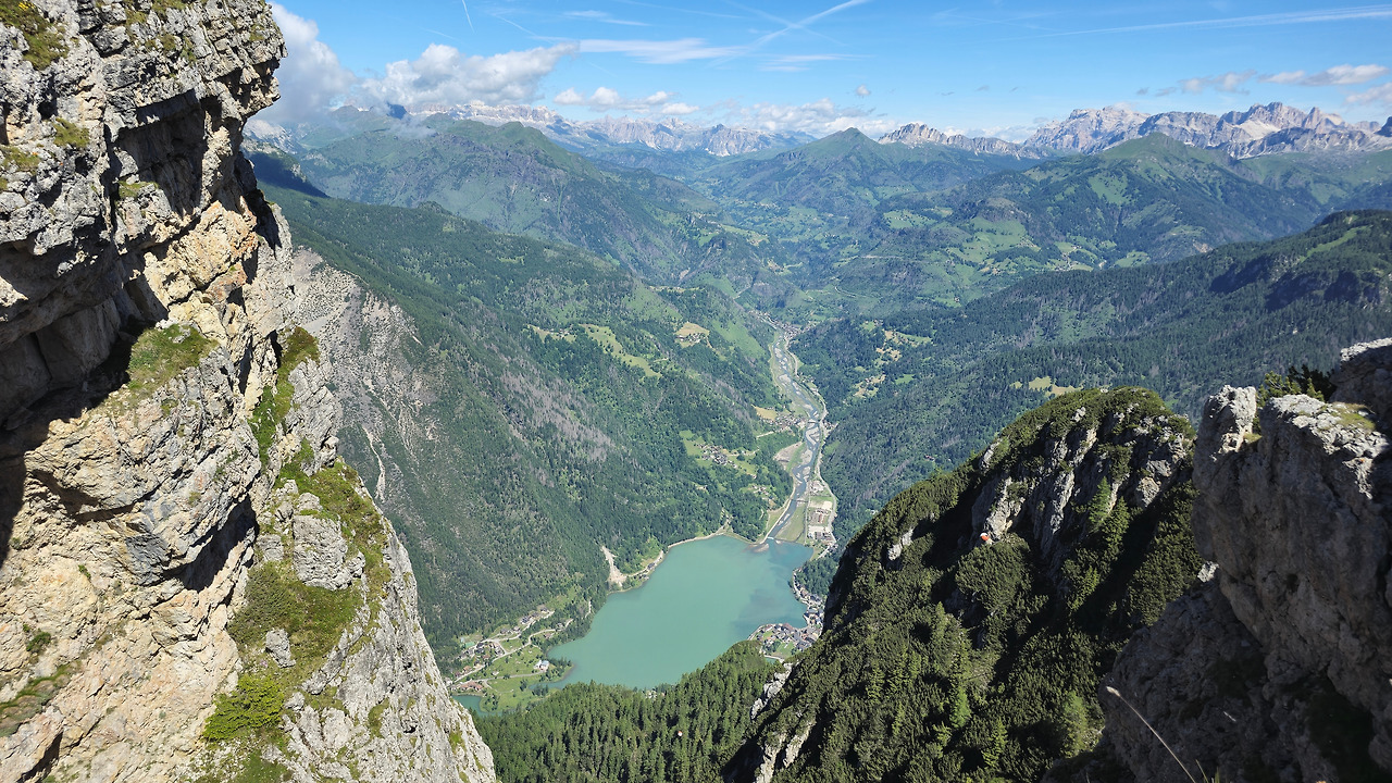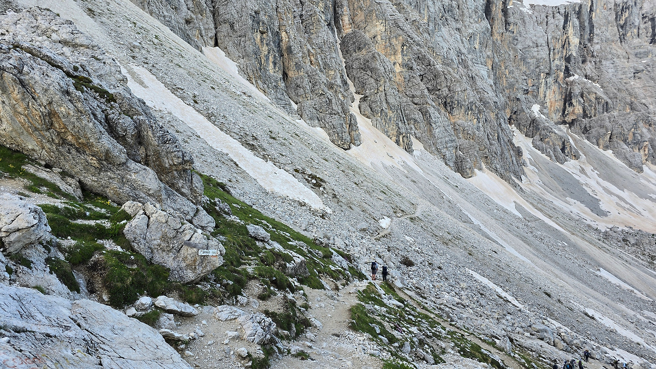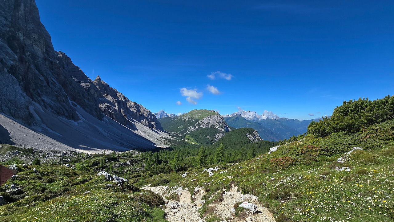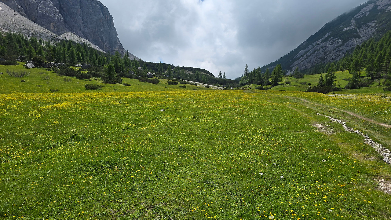 고소공포증이 있으면 바위 끝에 서기 두려워지는 그곳에서 내려다보니 저 아래 알레게 호수(Alleghe)가 보인다. 그때까지도 그곳 어딘가에서 자는 줄 알았는데, 나중에 가보니 잠자리는 전혀 다른 곳이었다. 그때까지 오늘 돌로미티 풍경 맛집은 여기가 전부인 줄 알았다. 진짜 자연이 주는 풍미가 따로 준비되어 있다는 것을 몰랐다. 힘들어도 올라가길 잘했지라며, 360도 경치를 즐긴 후 내려와서 예정했던 등산로로 접어들었다. 그렇게 걷다가 걷다가 보니 아주 넓은 들판에 내려와 있었다. 맙소사!